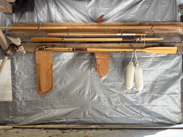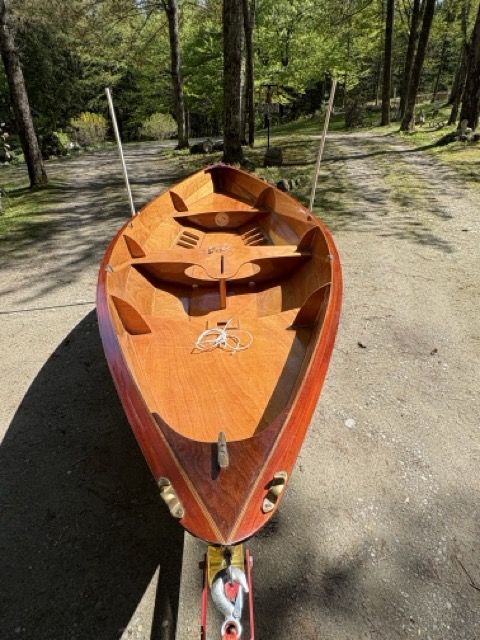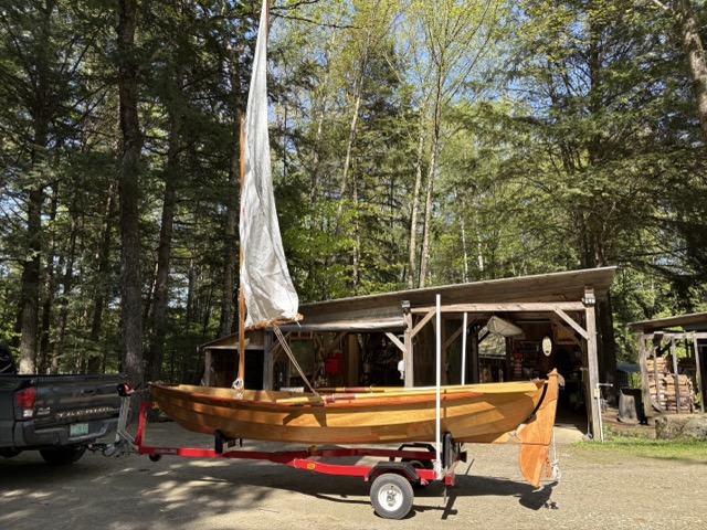Chesapeake Light Craft design. Spritsail and rowboat. Modern wood and epoxy construction. Two rowing stations with forward and aft thwarts.