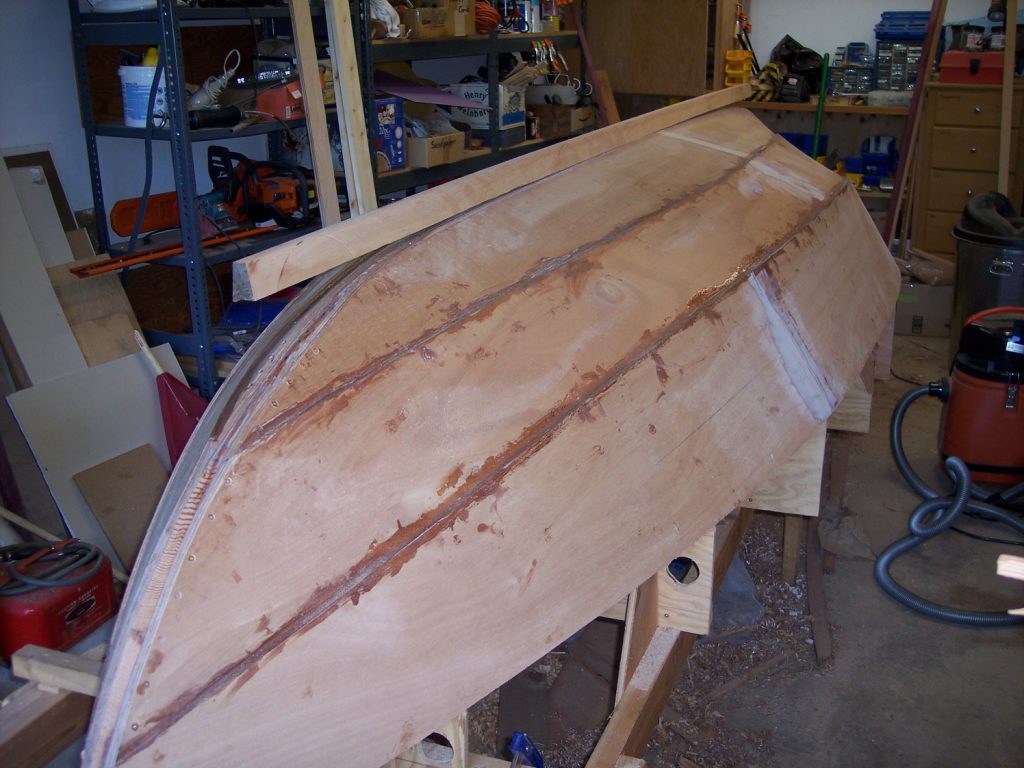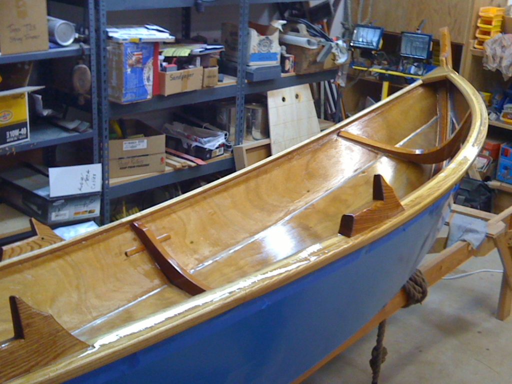 The construction is of okoume marine plywood, assembled (glued) with epoxy. The whole boat is coated with clear epoxy, two coats of primer and three coats of top coat. The stem and g’wales are laminated with epoxy and finished with two coats of System III clear coat.