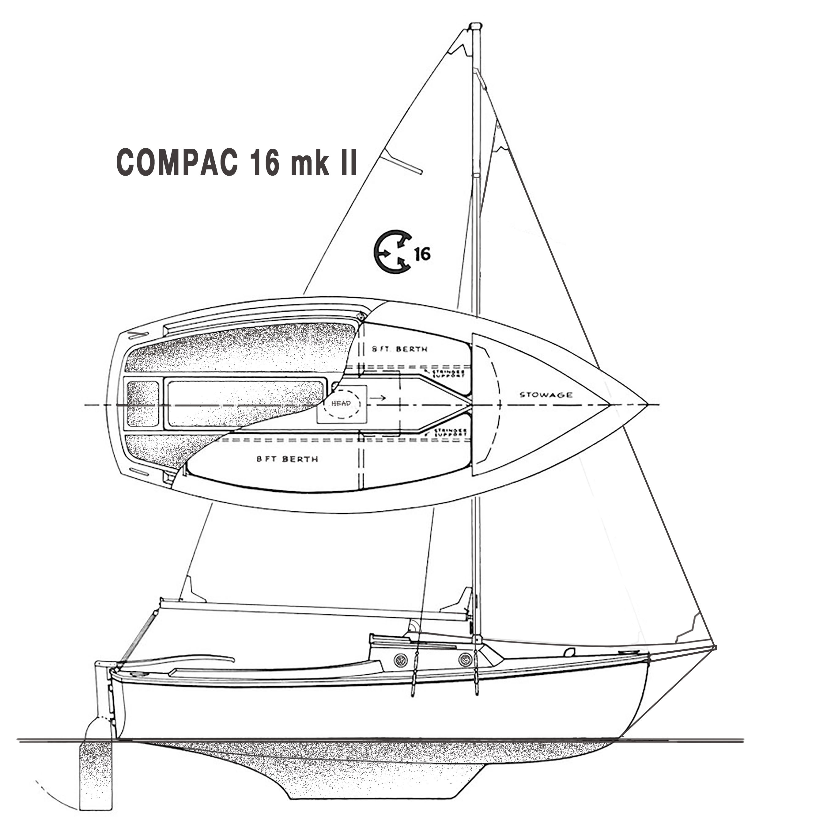 COMPAC 16 Mk II, FG, 1987, Slow Dancer. Sound and loaded with gear. LOA 16.93’, LWL 14’. Stable pocket cruiser (beam 6’) over a ballasted mini-keel drawing 18”. Tiller steers the newer Compac airfoil rudder. Generous cockpit (7’) for family daysailing, snug cuddy for cruising a pair. Main & jib (total 100 ft2), 5 oz (main w/ 2 reeflines, jib 1), additional 3 oz 130% Genoa. This set of sails used 7 times in fresh water. Tabernacle mast specially fitted to be raised alone. Boom tent, gas stove, many spares, tools, anchor, multiple docklines, Thetford Porta Potti, dedicated space for batteries and icebox, optimistically wired for a never-purchased electric outboard. Pristine Hutch joint-launch trailer. Robust hydraulic jack included for road service. Splendid adventure boat for young couple/family but not, alas, for elder owner.