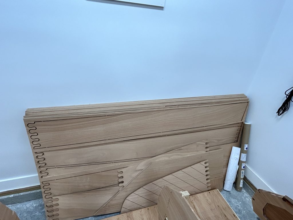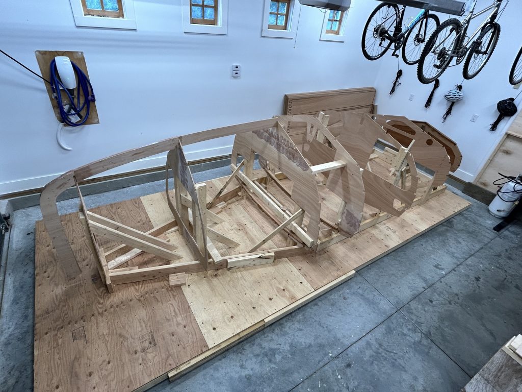 The bulkheads have been assembled with West System epoxy, including clear Douglas Fir deck beams bent into Nos. 4 and 5 as required. The transom has been laminated to the correct radius from three sections of marine plywood and West System epoxy. The laminated stem has likewise been assembled with West System. None of the stringers have been installed, all bulkheads and the transom can readily be removed from the building frame and stacked for shipping. Delivery may also be possible within a reasonable distance of Boston, MA.