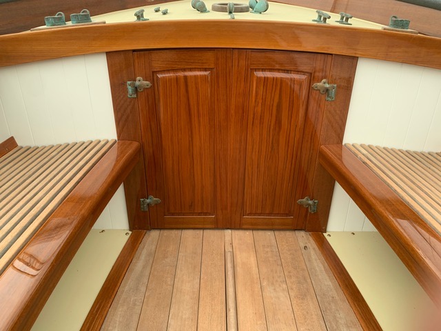 INTENT, being the first hull to be built from the original hull form, added to the imperative that the build be of the first order. Attention to detail is evident throughout. Herreshoff Manufacturing Company’s high order of yacht joinery and finishes begat the standard known world wide as “Bristol Condition”. HMCo’s fine joiner details are found throughout the build. Sailing is an exquisite experience surrounded by the straked bulkheads, planked ceilings, raised panel cuddy doors. The sculpted seating details were developed from an exquisite large schooner deck bench design from the 1920’s and enhance a long and comfortable day sail. All typical of Herreshoff’s large yacht interiors.