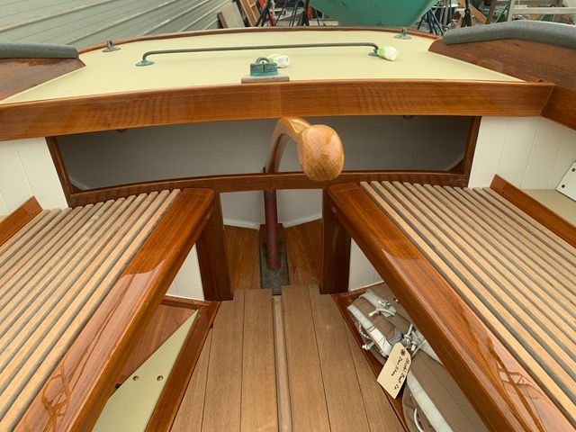 Sailing INTENT – N.G.H. noted in this design this hull as a “Pleasure sailing keel boat”. It is indeed a “pleasure” to sail. The full rudder hung keel tracks and turns with ease. Busy harbor work and making moorings makes maneuvers sweet and easy. All the halyards, control lines are worked from the cockpit. The jib is launched, reefed and settled at the mooring on a Harken fuller. The jib is set on a self tending club. The lines are set up so single handed sailing can be done from the tiller. Guests never have to fuss with lines. All and all there is no need to to go on deck.