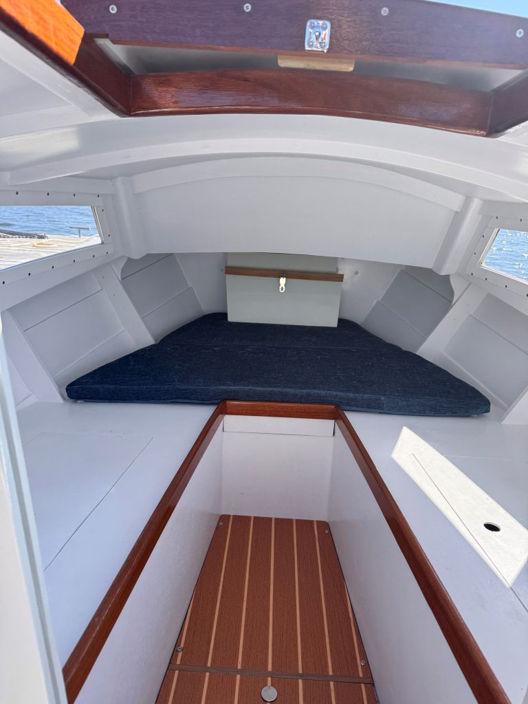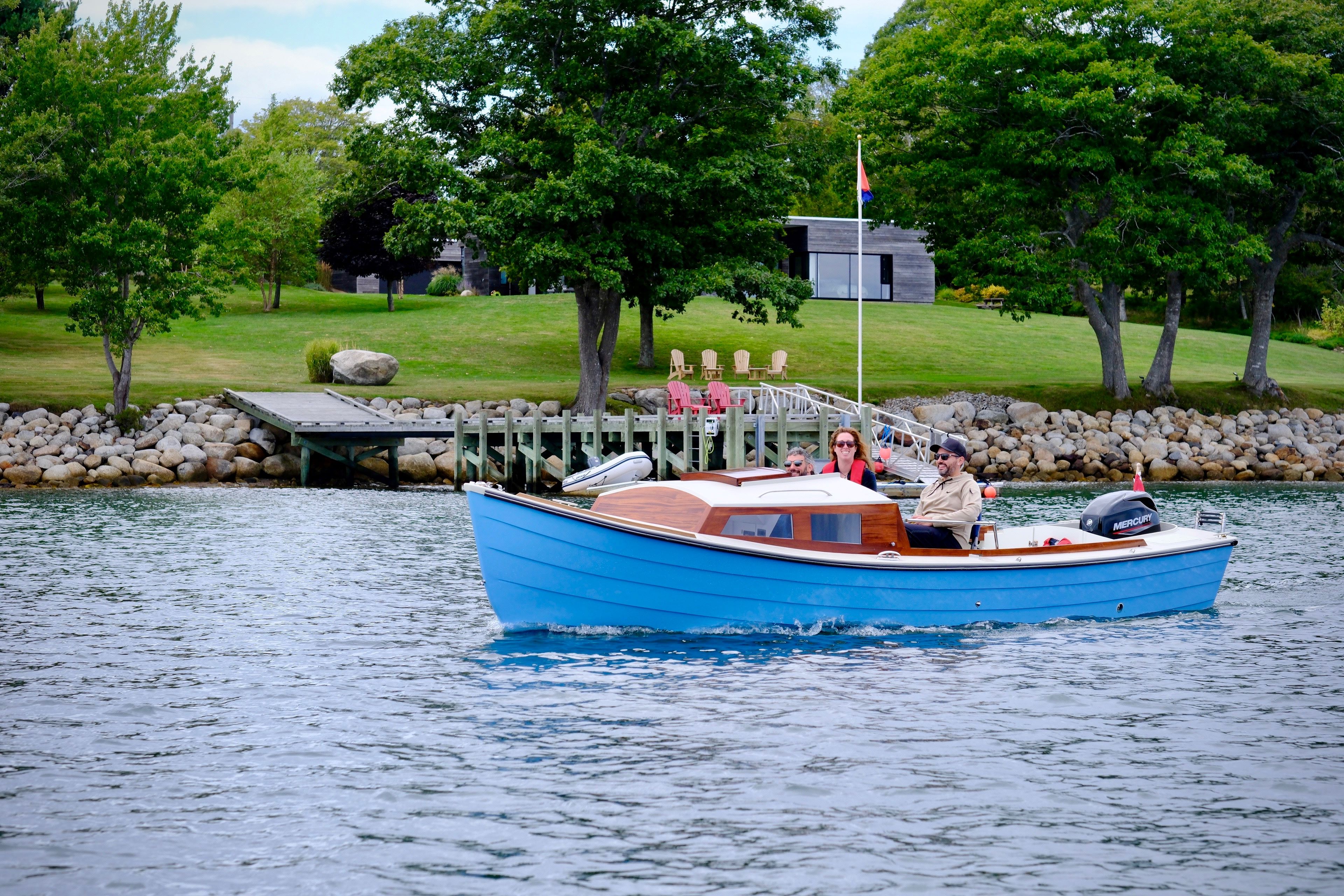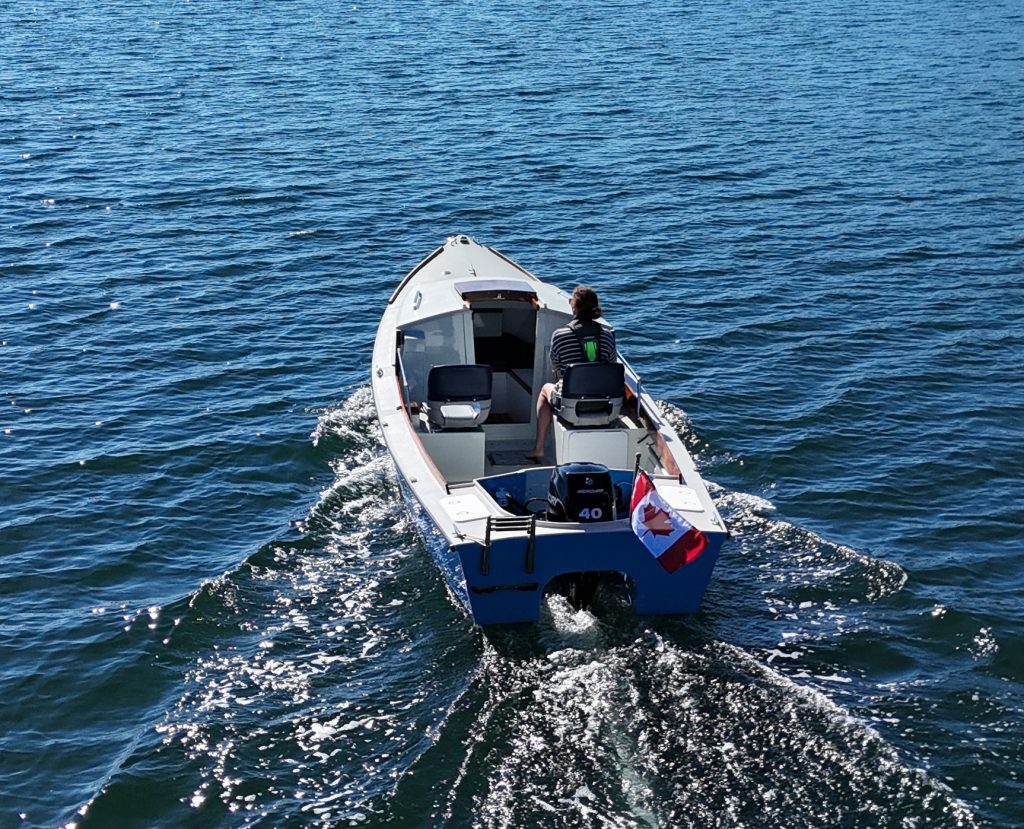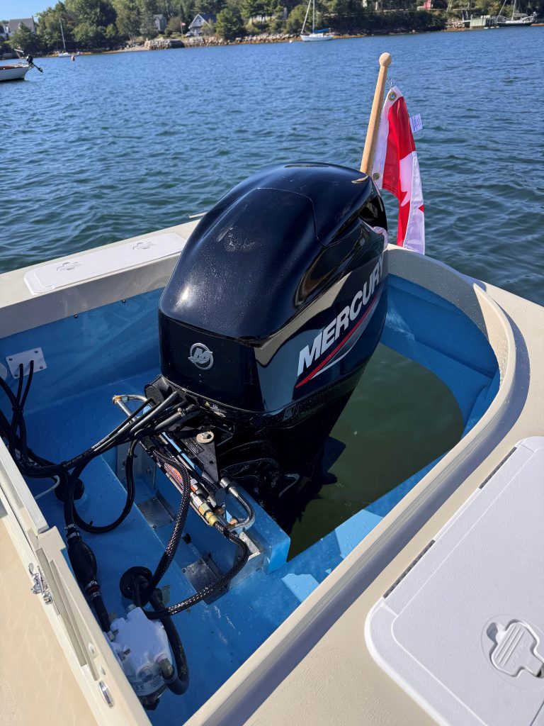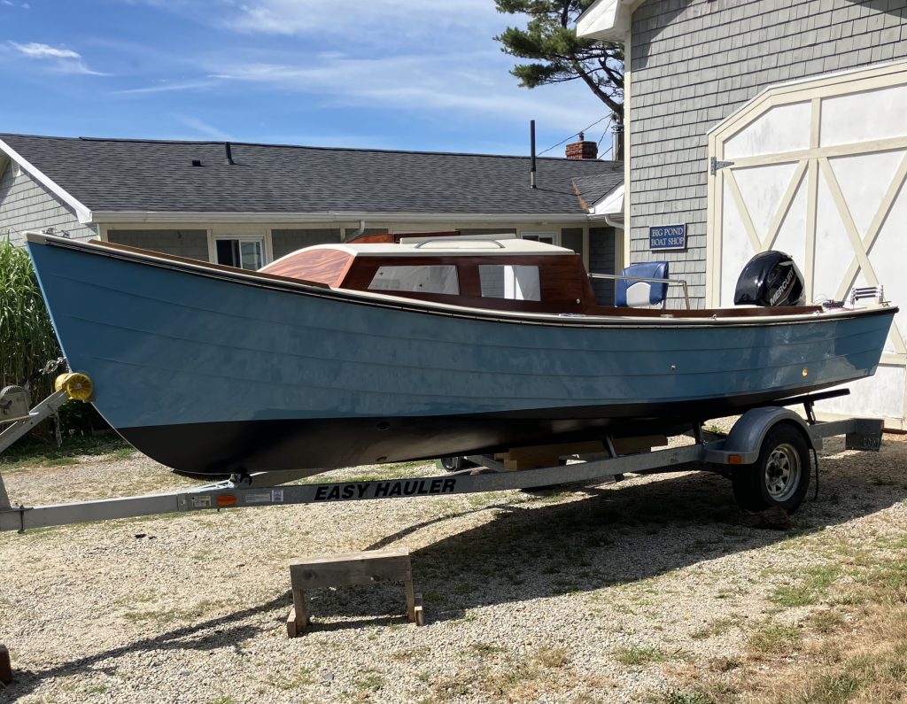 Boat Show special price is listed in Canadian Dollars. John Atkin designed this 22′ outboard skiff-cruiser. The hull shows a healthy deadrise (V-shape) up forward, which wraps down to about 15% amidships and disappears in a flat bottom at the transom. All this shape gives a boat that planes easily across smooth water, and yet cuts smoothly through a harbor chop. Built and completed in 2025 by Big Pond Boat Shop of Mahone Bay, the boat is of composite wood construction. AWLGRIP finish with varnished mahogany brightwork