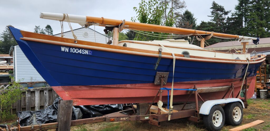 Pelican currently sits on a trailer in our driveway in Naselle, WA double-tarped against the winter wet. We are willing to sell our 1995 F250 4WD 7.3L diesel (171,000 miles) with the boat. Asking price is $25,000 for all or $15,000 for just the boat & trailer. This is below break-even price but we are open to reasonable offers. Our plan was to sail upriver out of Cathlamet until we were confident enough to move down to Astoria. Now a new job takes us to Alaska and we’ll tow her if we must but would rather travel light. This is a great opportunity to get into an electric boat of unique design built by a master craftsman – with every line fair and no questionable wiring.