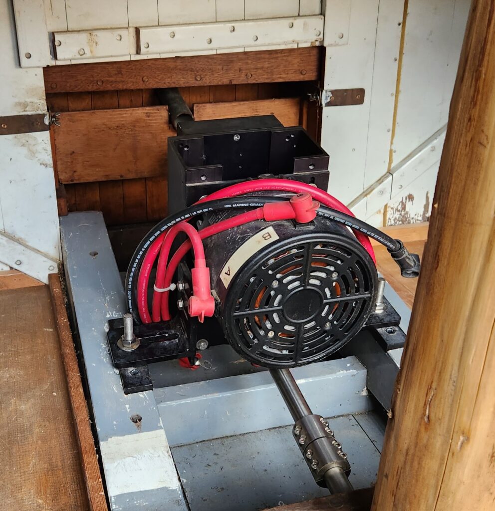 There is one bad frame which is why I haven’t poured the ballast or finished the wiring. The plan was to add a single battery 12v house system, separate from the propulsion system once the primary wiring was done. The pine battery trays should probably be refastened as I built them with galvanized nails. Hull paint is in good shape but her bottom will need caulking and her cockpit will need new paint and sauce. If the ballast is poured, she will need a 2nd bilge pump (one forward, one aft). Running lights, shore power inlet, and solar panels were planned adds.