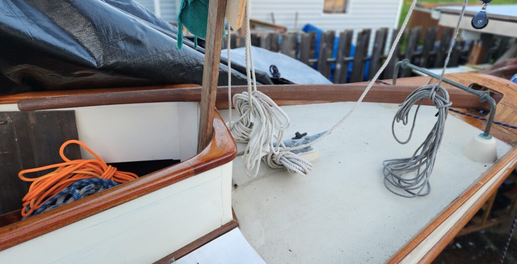 The boat is clinker-built – copper riveted Port Orford cedar strakes bronze-fastened to sawn Douglas fir frames. Interior finish is some variety of boat sauce. She smells fantastic. Her oval cockpit is large and deep. There are two forward berths in the cuddy cabin. Her canvas deck is in good condition, as is her mahogany tiller and varnished spruce spars. Her Hasse sails have been re-registered with PT Sail Loft. All rigging, mast wedges, hardware, etc that came to us will go with her, as will the wiring diagram. Due to time pressure we may have Revision wire it for us now if Matt can fit us in.