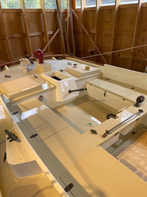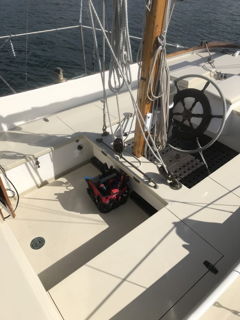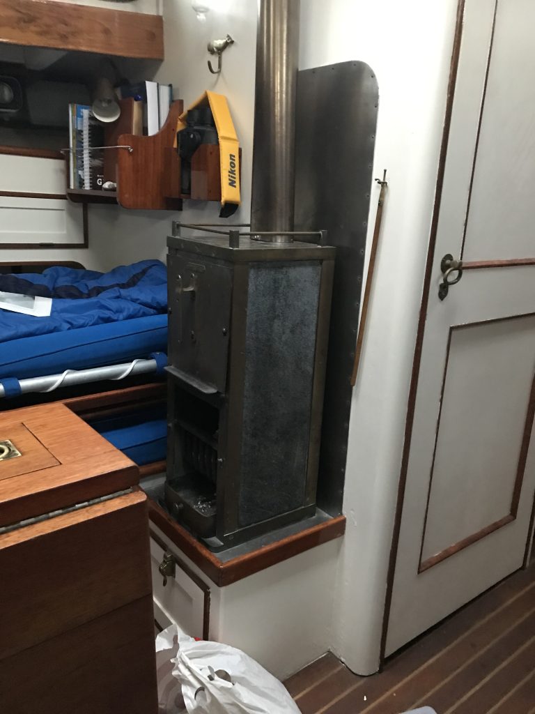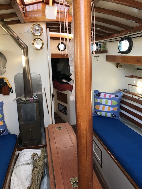 Midship – varnished Drop Leaf Table on centerline below opening Butterfly Hatch – Bronze and Soapstone Maiwald fireplace/cabin heater.Cockpit – spacious, abundant storage under four cockpit lockers – additional storage under two aft deck hatches