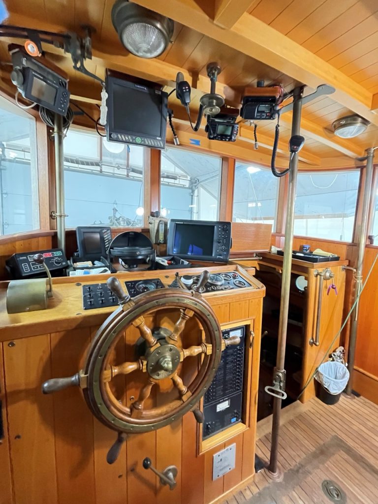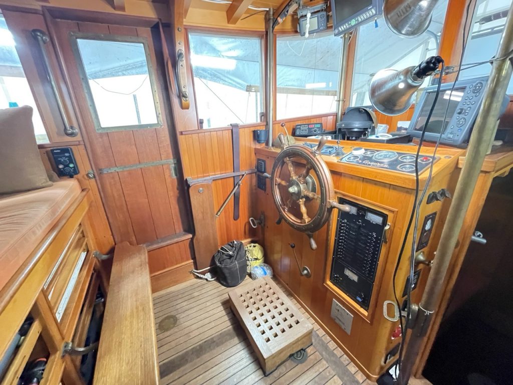 The spacious Pilot House has a High athwartship Settee aft with Excellent Visibility forward – equal to when standing at the Helm. A permanently mounted Auto Pilot Control is at the port side of the settee – enabling operation of the vessel offshore when Clear of Traffic almost continuously from the settee. An Excellent view of the instruments is also provided from the settee. A “swing up” adjustable helmsman’s teak seat is at the wheel; also a teak helm stand. Kobelt single lever engine control; Kobelt hydraulic steering with re-built traditional Teak Wheel; the number of turns hard over to hard over is adjustable. Kobelt Jog Lever at helm station and also at stb’d bulkhead. Teak sliding doors each side. The outboard / fw’d Windows may be lowered into their copper drain pockets via their wide leather straps. Large swing up Engine Room Hatches provide good engine access. The interior pilot house sides are finished in satin varnished Douglas Fir narrow vertical staving with V grooves. The teak sliding door casings, window stiles & casings & all pilot house trim are Tung oiled VG Teak. The sole is laid teak.