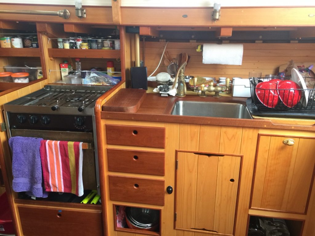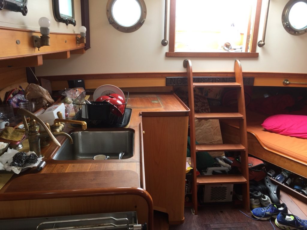 Equipment: Kinematics West Coast Reel type Hydraulic Anchor Winch on Foredeck; Two 100 lb+- Forfjord Anchors in Roller Chocks at stem; 1/2” BBB Chain & Nylon Braided Rode on winch. A second rode is coiled on deck. A two speed manual winch is mounted on port side of the hydraulic anchor winch frame – used for raising & lowering the mast, and also very helpful when hauling a heavy mooring pendant up thru the chock in a breeze of wind! Small