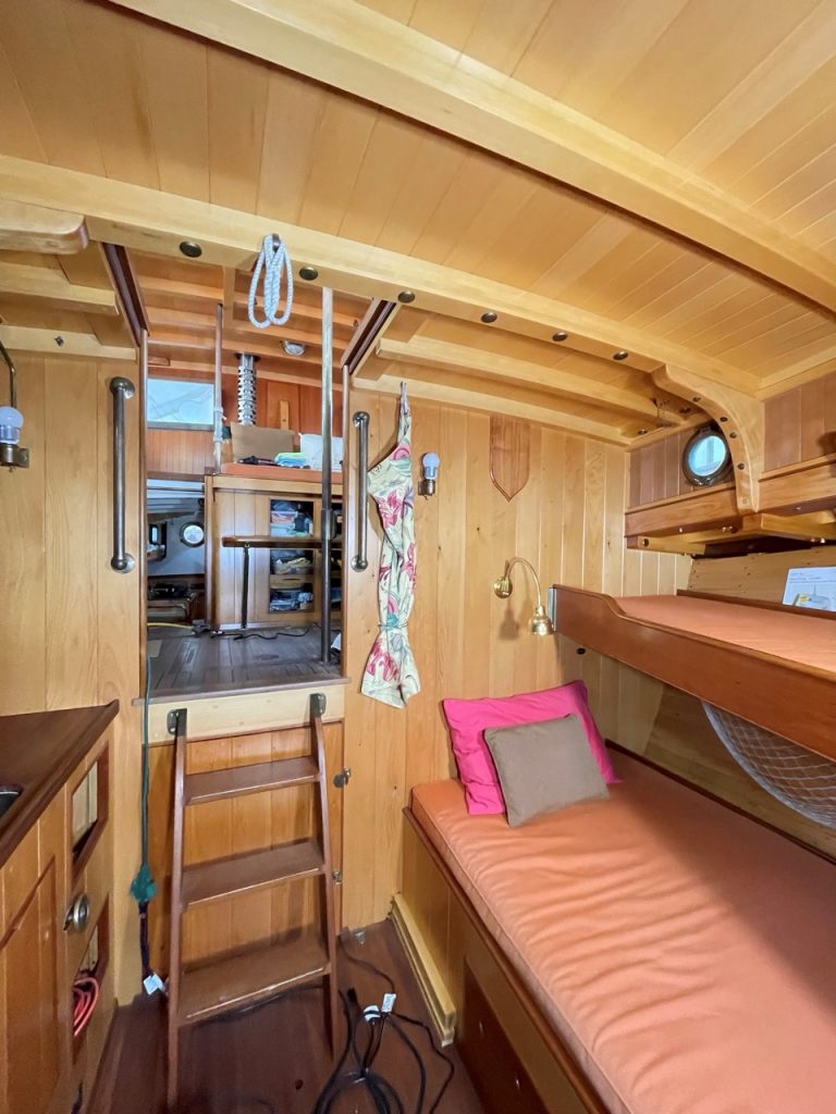 Rigging: Roller Furling Steadying Sail. Round Aluminum Mast in Tabernacle at aft end of pilot house. Mast may be lowered & seated in the Gallows Frame way aft. We do this once a season – for her inside storage.