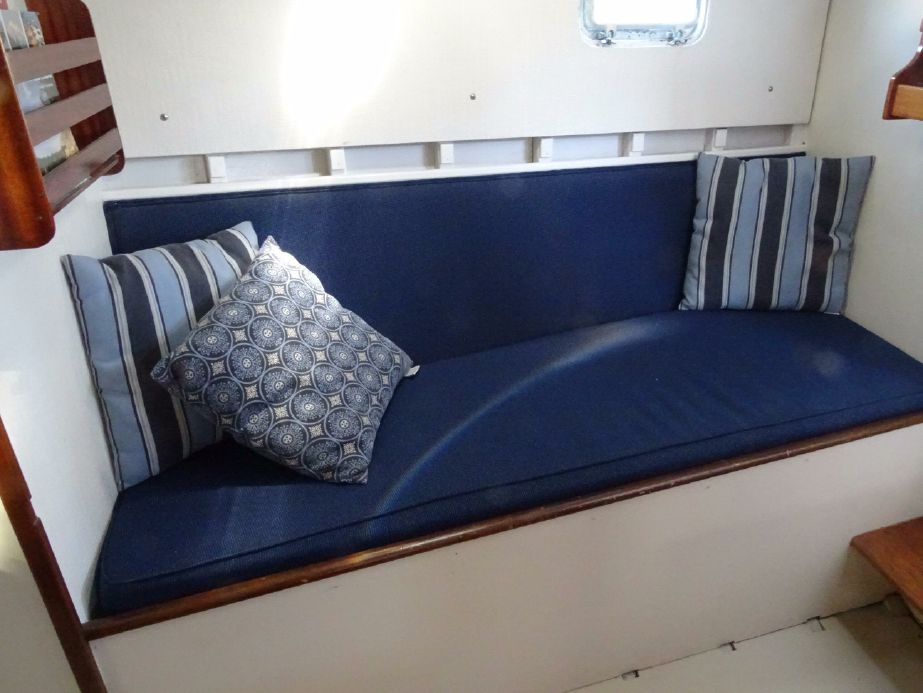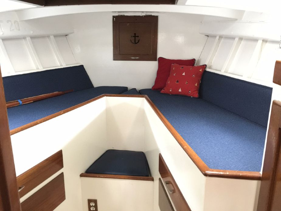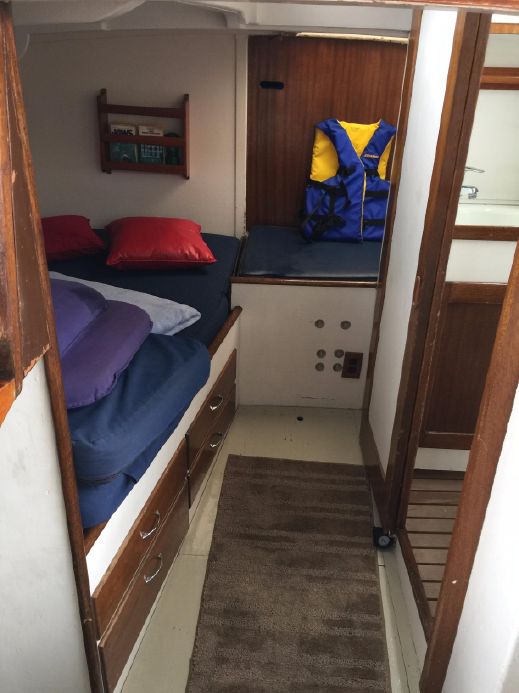 The main salon is just two steps down from the large cockpit. This main cabin with her raised salon is the feature that is most memorable. The sit in and see out design is what makes her unique. On the port side is a raised U-shaped gimbaled dinette table that is a wonderful spot to enjoy the scenery no matter the conditions outside. There are drawers below both fore and aft and under the outboard settee. There is also a stool inboard of the table. The galley is across to starboard with eye level windows allowing for a beautiful view even while doing the dishes. She has a 3 burner propane stove and oven, double sink with retractable faucet, newer counter tops and refrigerator/freezer unit. Outboard of the galley is addition storage in sliding cabinets and drawers. Moving forward down two steps is the mid cabin with pullman berth to port and a settee (skinny berth and best offshore place to sleep!) to starboard. There is also a navigation station next to the master berth. There is storage under both berths with drawers to port in addition to the under berth storage. The enclosed head is just forward on the port side and the large hanging locker is to starboard. Outboard in the head is a counter with sink aft with enclosed storage below. There is a V berth forward with 2 single berths, drawers below and storage above. At the bow there is hinged access to the chain locker. There is a large opening hatch in the forward cabin. The aft cabin is accessed by two steps down from the cockpit. The aft cabin features a double berth to starboard and a head to port. This head has an attachable shower head and shower stall with sump pump. The engine room has entry on both sides from the forward bulkhead of the aft cabin. The batteries sit under the aft cabin steps for easy access. There is a large “garage” at the aft end of the boat that is accessed from the aft cabin with lots of stage capacity for sails and offshore gear.“Sea Fever’s cockpit is a special place. Whether sailing the Pacific Northwest or offshore, she is safe and secure with a large wheel on a centered pedestal, easy access to the large primary winches and end boom sheeting for the main is right there at the aft end of the cockpit. She has a solid windshield, dodger and removable bimini top for protection in addition to full enclosure panels for those rainy days. There is good storage in outboard lockers as well as two long lazarettes to port and starboard. Along with the raised solon, the cockpit is the other unique and special feature of “Sea Fever’ She will be forever remembered for her fabulous entertaining and comfortable sundowners for so many people. She has comfortable seating for 8-10 but has accommodated up to 20 in Tonga! The