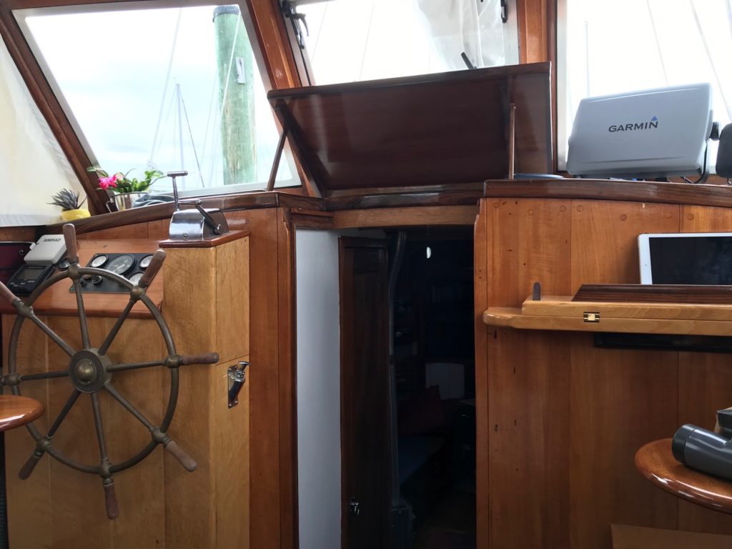 She’s a very well built, well maintained and comfortable vessel. Built by EF Elkins 1952 (England) Fred Parker design. 44’ lod, 50’ loa, 39’ lwl, 11.5’ beam. Full controls in pilothouse and outside. Ford Lehman 120 with approx 1800 hrs since remanufacture in walk-in engine room with work bench and storage.