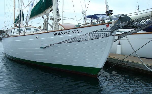 Morning Star is a Scandinavian style double ended ketch, custom designed and built in 1948 by Norwegian Naval Architect Olaf Tellefsen. She is planked with 1 3/8” Port Orford cedar over steam bent white oak frames on 12” centers, is 51 feet overall, 45 feet on deck, has a 40 foot waterline, 6’ 10” draft, ~25 ton displacement and carries 1200 sq. ft. of sail.