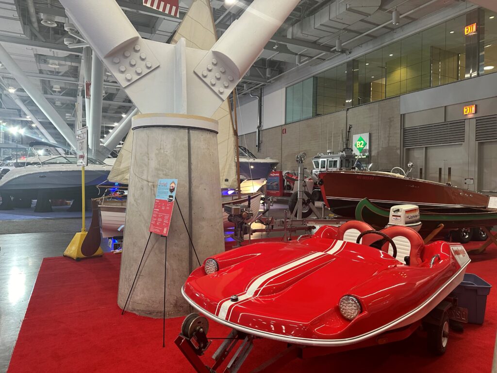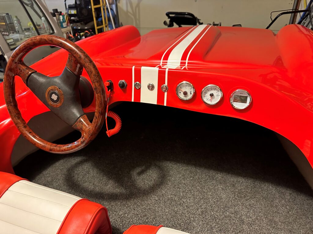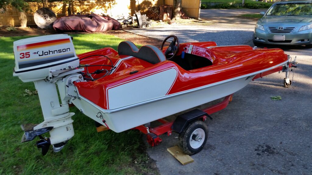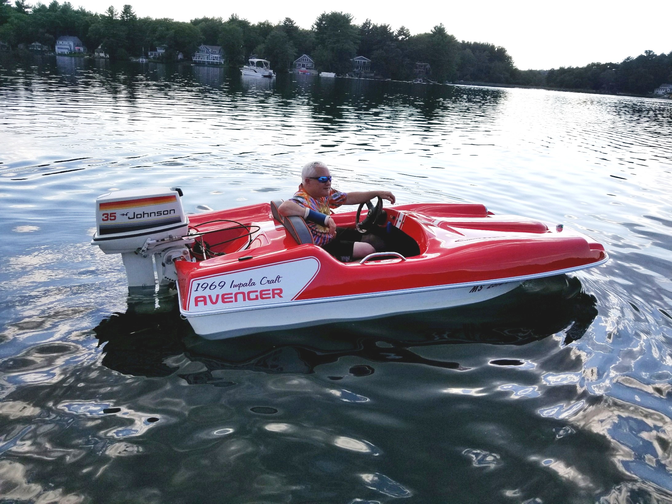 1969 Impala Craft Avenger is a very rare, fully restored fiberglass 2-seat 10-footer with headlights and an outboard motor. It looks like a little red sports car on the water, and is tons of fun up to 30 mph!