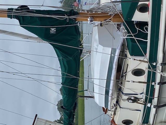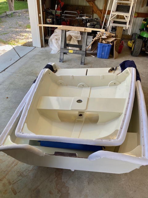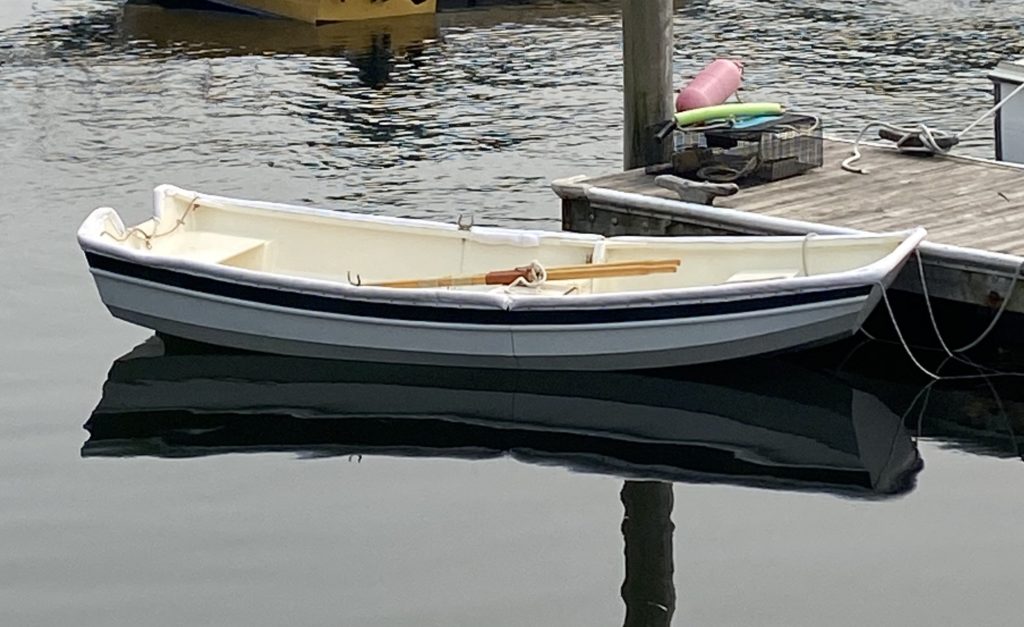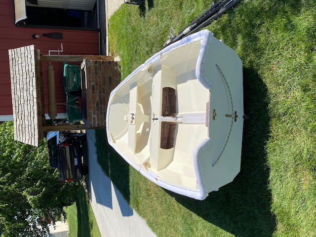 Skirl is a nesting Oonagh designed by Doug Hyland. Nested she fits nicely on the cabin top and under the boom on our Bristol Channel Cutter Thistle. Each half weighs less than the inflatable she replaced. Skirl is very stable, we can row sail or motor and it is easier to tow than the inflatable.