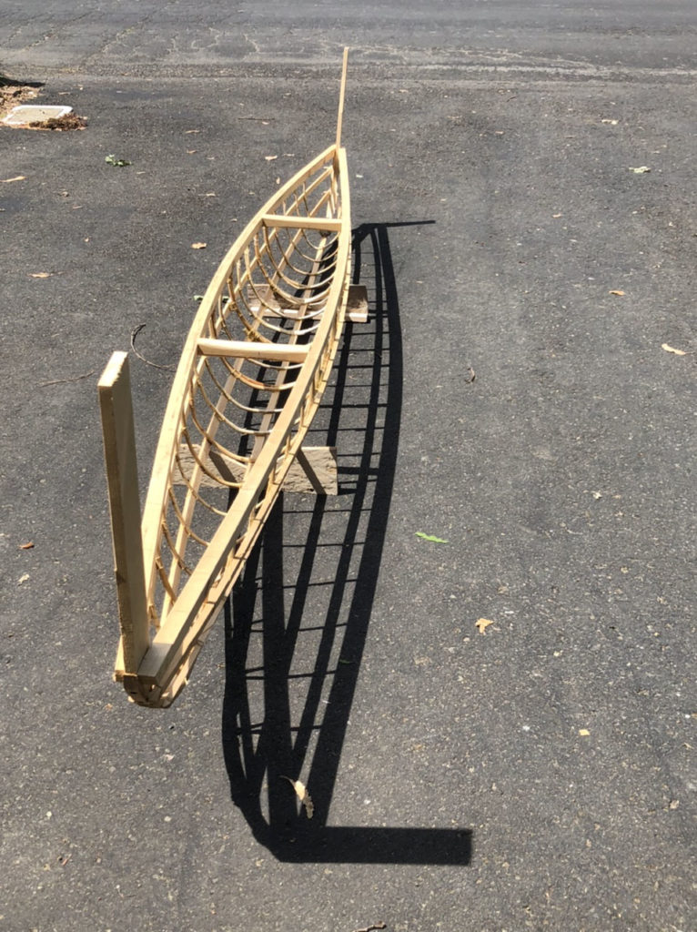 Ultra lightweight outrigger canoeThe ribs are made from willow branches [ala Hillary Russell] The skin is nylon with a urethane coating [ala skin boat store in Anacortes] The ribs are whittled to a 3/8″ mortice [ala Veritas mini tenon cutter]. On the smallest branches, I found I could cut a tapered tenon with my carpenter’s pencil sharpener!