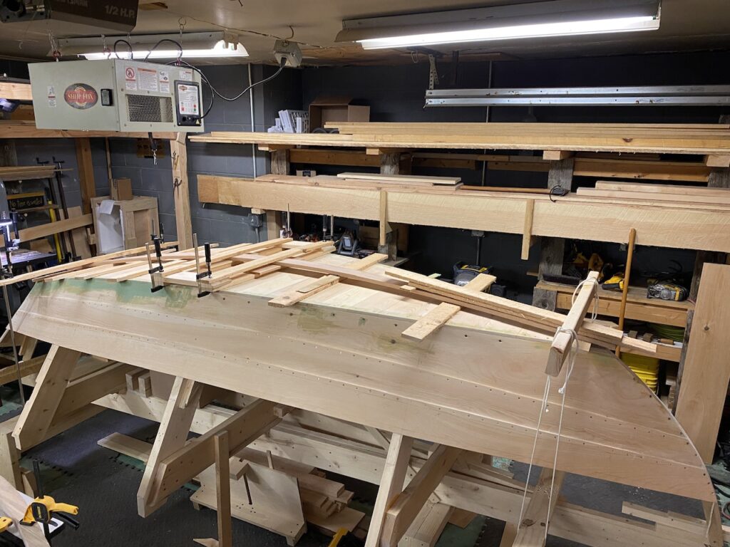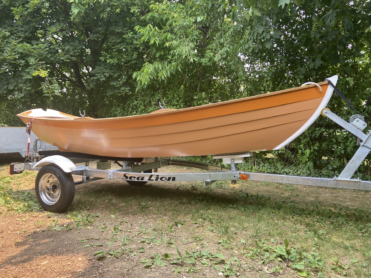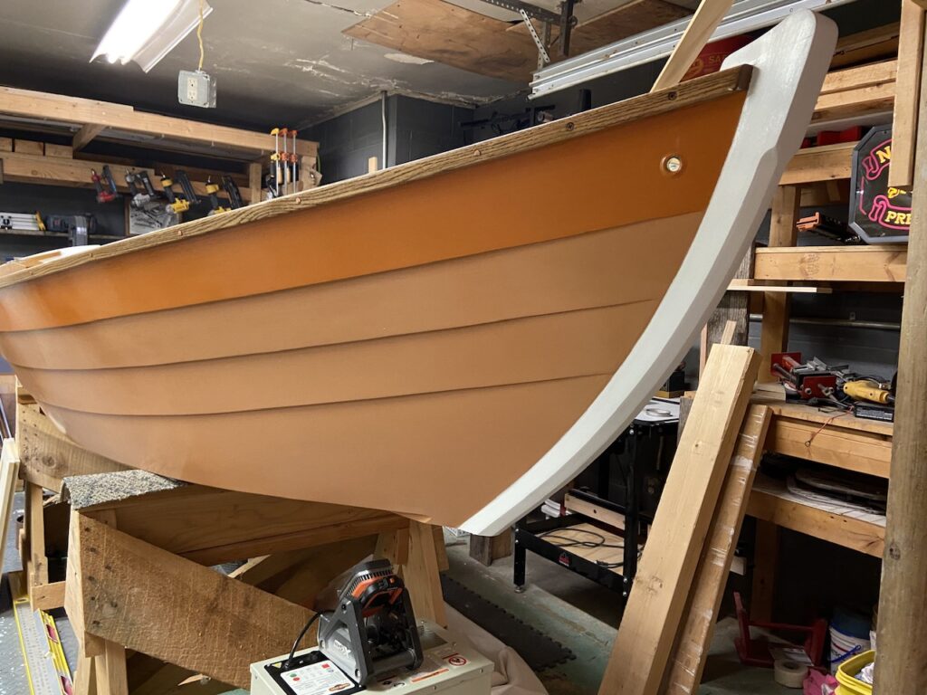 Built in 2021 is the Yankee Clipper designed by Joel White. Eastern white oak and white pine are the woods used throughout. The boat is built with a double hull bottom with muslin and bedding compound between the two layers. The strakes are planed to 3/8” and fastened to each other with copper every two inches. All other fastening was done using bronze coated screws and nails as specified. She took two winters to build and it was an absolute joy to be involved in a project like this. She is light, responsive and fun. And she is quick.