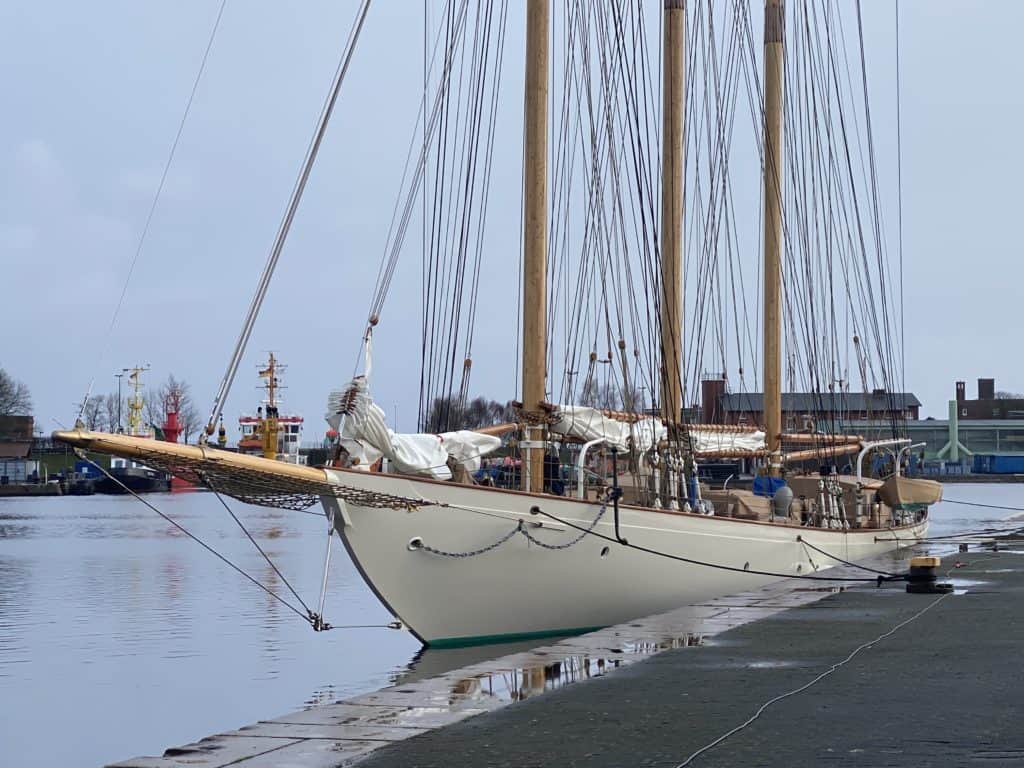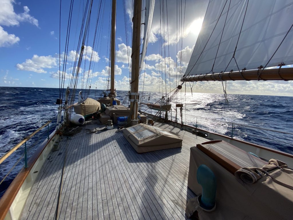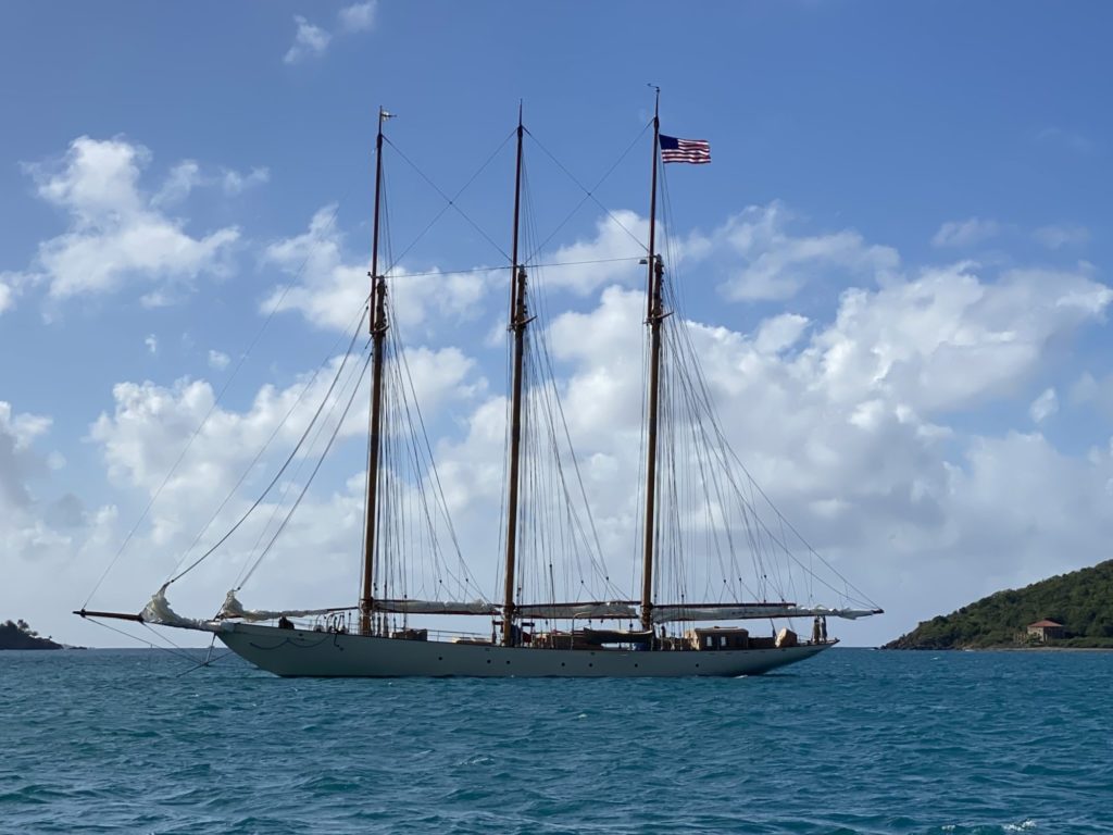 John Alden’s design 347 (“Wolfhound”) is a quintessential American yacht with roots descending from the great tradition of the “fast and able” New England fishing schooners. With the pilothouse aft she is unquestionably an American schooner.