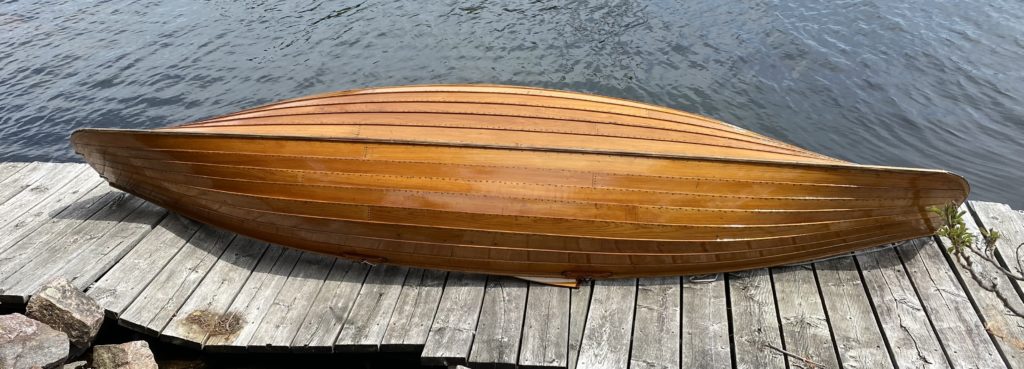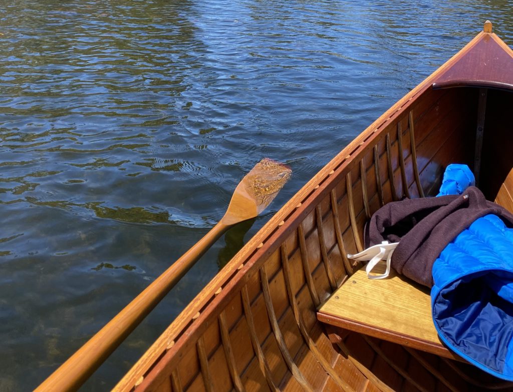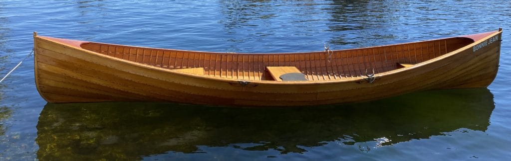14 ‘ Rushton 109 pulling boat named Bonnie Jean after the original owner’s wife. One of 10 (4 of which were varnished) built in 1987 at Mystic Seaport Museum to raise money for the museum.. I have owned her since 2014. When rowing solo, she behaves like a sportscar – turns on a dime, easily switches to rowing in reverse and accelerates quickly.