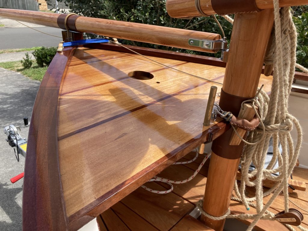 The kit was cnc cut but a furniture factory to my suplied plans and along with the marine ply features sapele keel, gunwales and centreboard trim. there’s also NZ native Kauri on the deck and some rimu in the rowlock risers. Sole and thwarts are macrocarpa. Mast and spars are Douglas Fir.