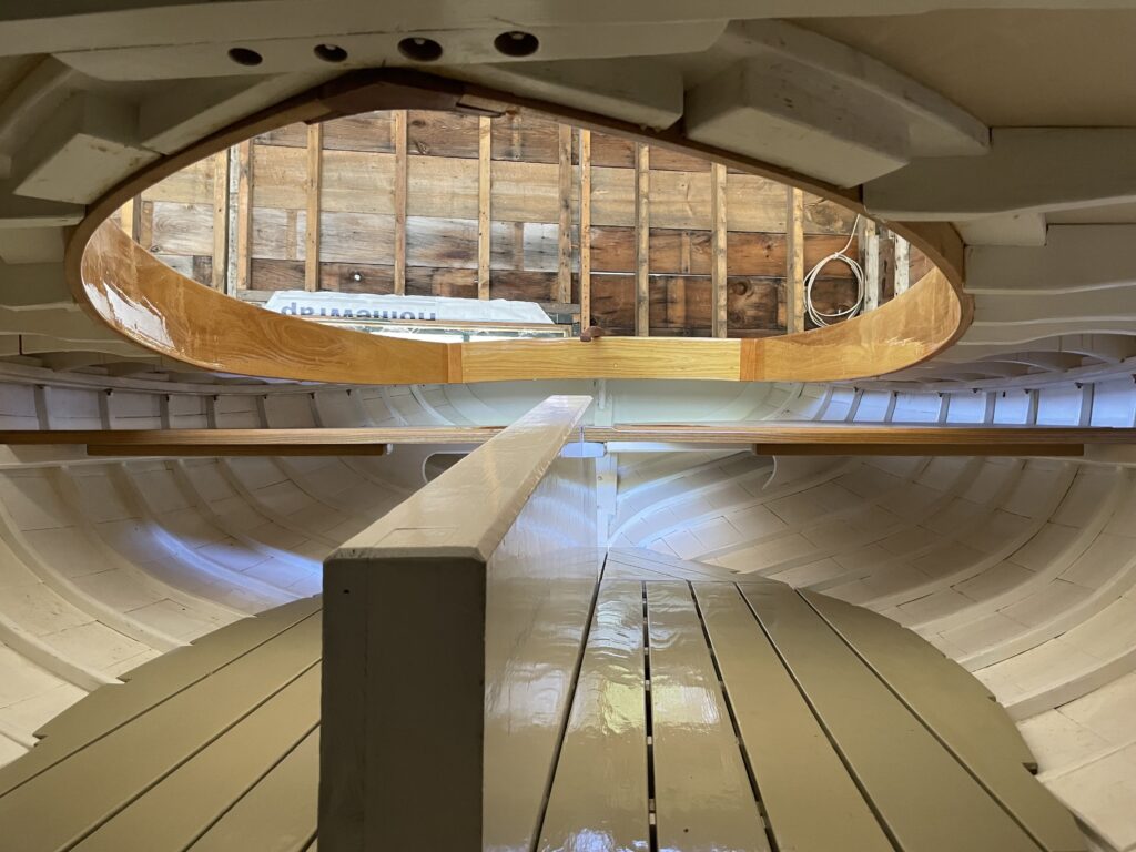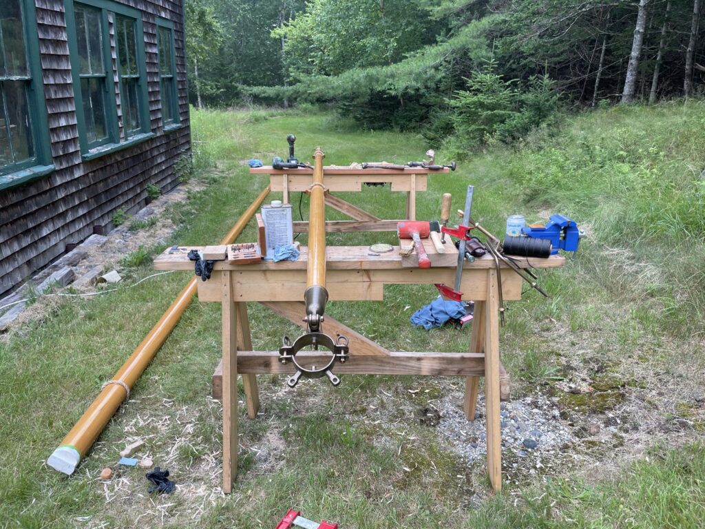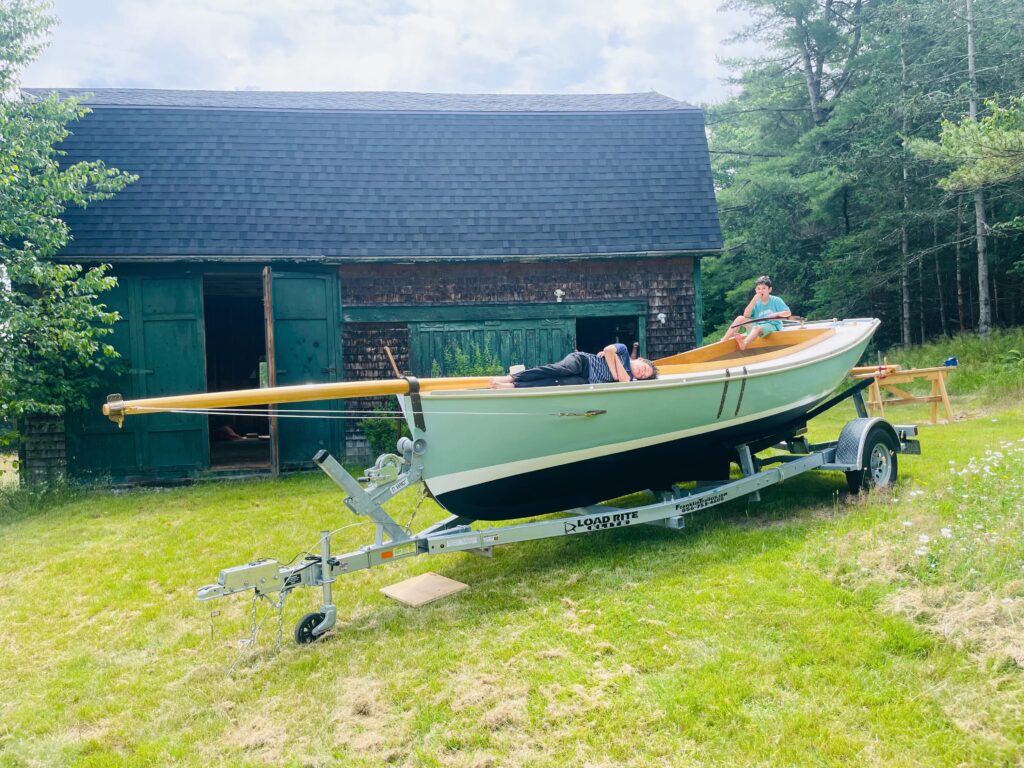 I began building this Paul Gartside cutter about 12 years ago in my (limited) spare time while employed as the Executive Director of the Philadelphia Wooden Boat Factory. Wanting to keep my craft skills alive I leased a space adjacent to the boat factory to serve as a small boat shop. With a growing organization and the birth of my sons, it turned out there would be many years when I could barely afford a few dozen hours to dedicate to the project. The process however was fulfilling, sometimes humbling, and experiment in resolve and patience. We moved the boat from our shop in Philadelphia to Brooksville Maine in 2022, where she waited for hardware to be completed. Phosphorescence was launched by Seal Cove Boat Yard in the summer of 2023.This particular Gartside cutter – known as hull 93a (gartsideboats.com) can be found on his website under the heading ‘Dinghies and Daysailors’. The hull was designed for strip plank construction. With Paul’s blessing my friend and boatbuilder/furniture maker Geoff McKonly (geoffmckonlyfurniture.com) redeveloped the construction plans for carvel construction. I assembled the backbone from Black Locust sourced from an Amish sawyer here in Pennsylvania. The hull is a mix of Eastern White, and Atlantic White Cedar, from Maine and NJ.