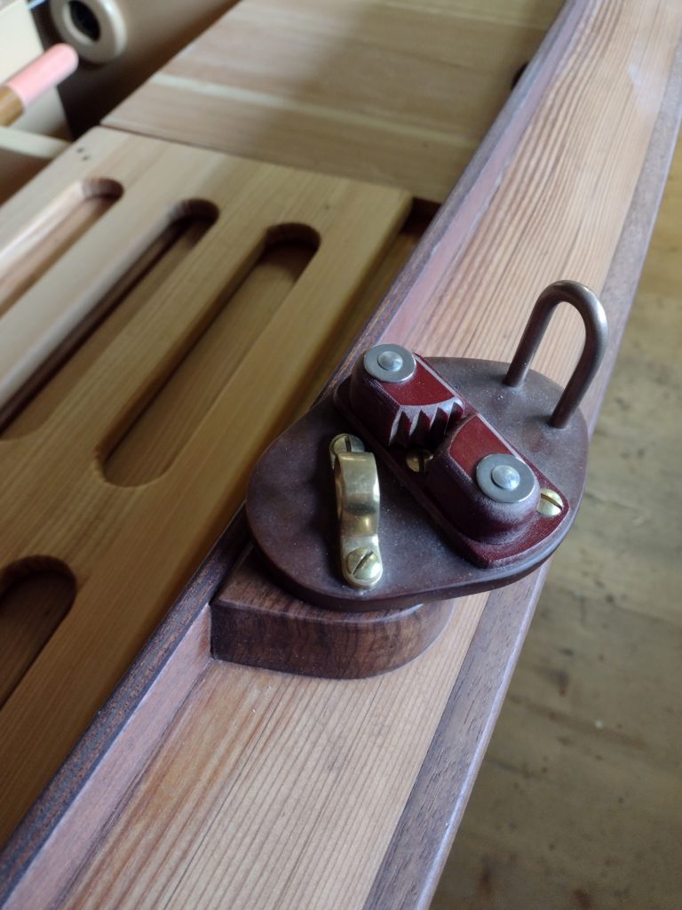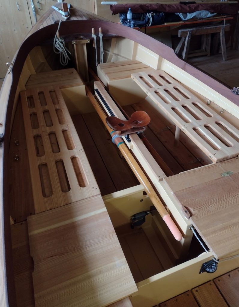As I have been a rower for the better part of my life I wanted to be able to row Amélie “properly”, meaning: a pair of long sculls, sliding seat, proper oarlock span, removable footbraces. This called for a slightly (4 inch) wider beam, modified bulkheads and a relocated and split forward buoyancy tank to stow the oars out of the way when sailing or camping. The sliding seat rides on two rails close to the top of the centerboard case and makes for good rowing performance. Amélie has therefore no engine and for shorter trips she can be sculled over the stern with the third oar on board. I find this extremely elegant, efficient and practical in tight spaces. This third sculling oar also serves as a sprit boom when sailing downwind.
