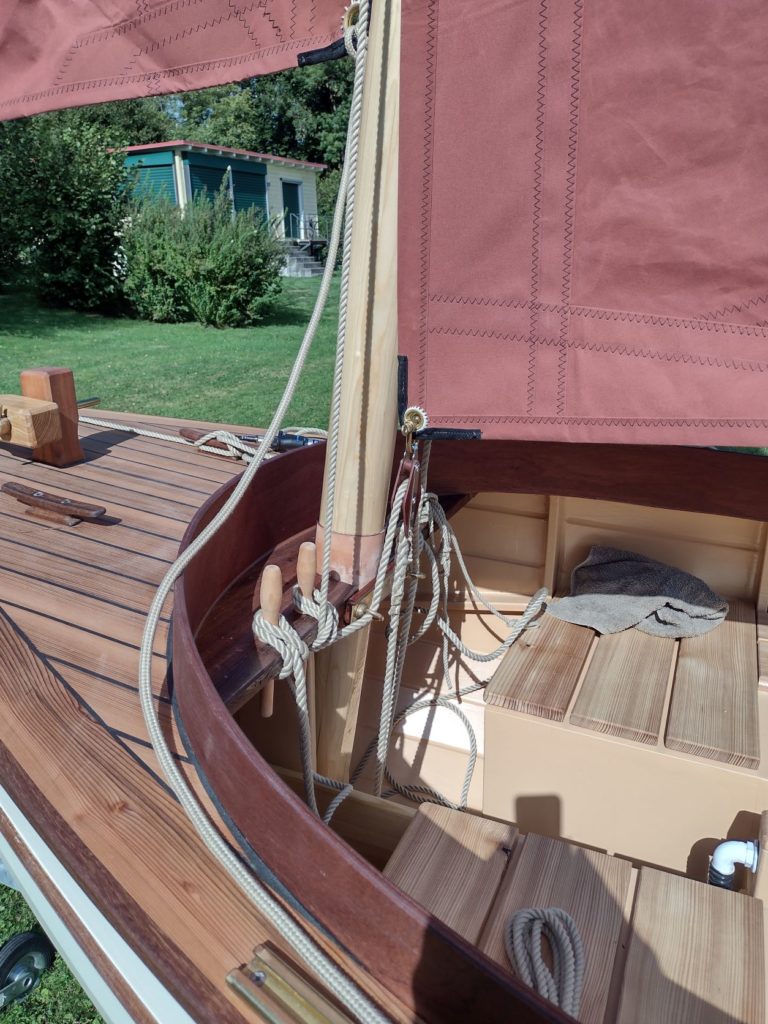The hull is built of Okoumé plywood, but I tried to use local lumber such as Pine, Larch, Walnut and Cherry as much as possible. Some long-kept thin mahogany plywood from an old project (a spectacular failure) finally also found its place.The Rig