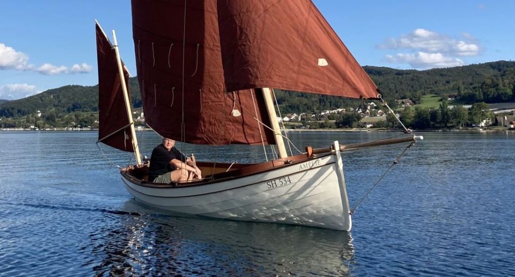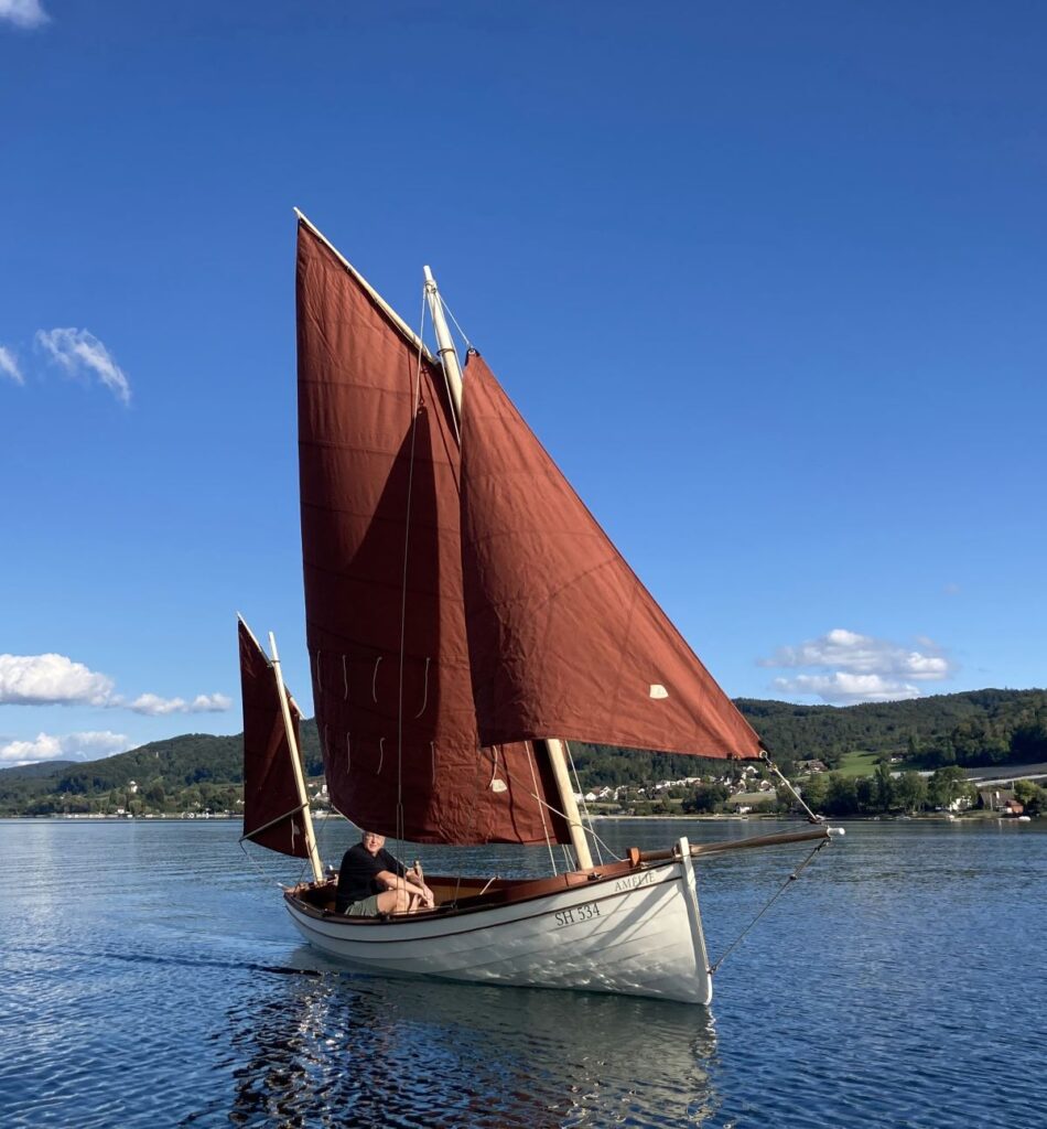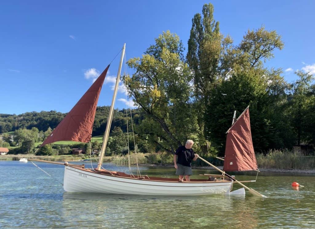 Yes, there is one mast , one sail and a few lines more than in a normal dinghy… But it is well worth it: The lug yawl rig is a huge pleasure to sail! She is beautifully balanced, self-steering and there are so many configurations to play around with, including sailing astern under mizzen alone and heaving-to. And if things are getting a little too excited we simply drop the main – a matter of five seconds. We sailed Amélie under mizzen and jib in pretty rough conditions comfortably and still to weather.