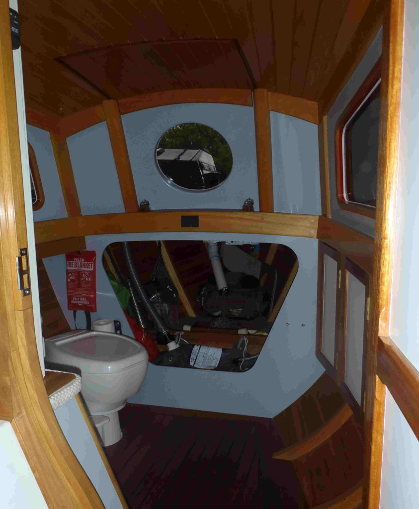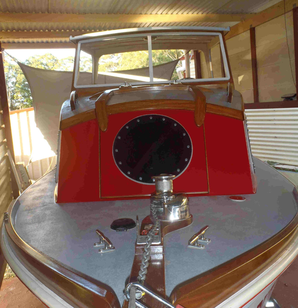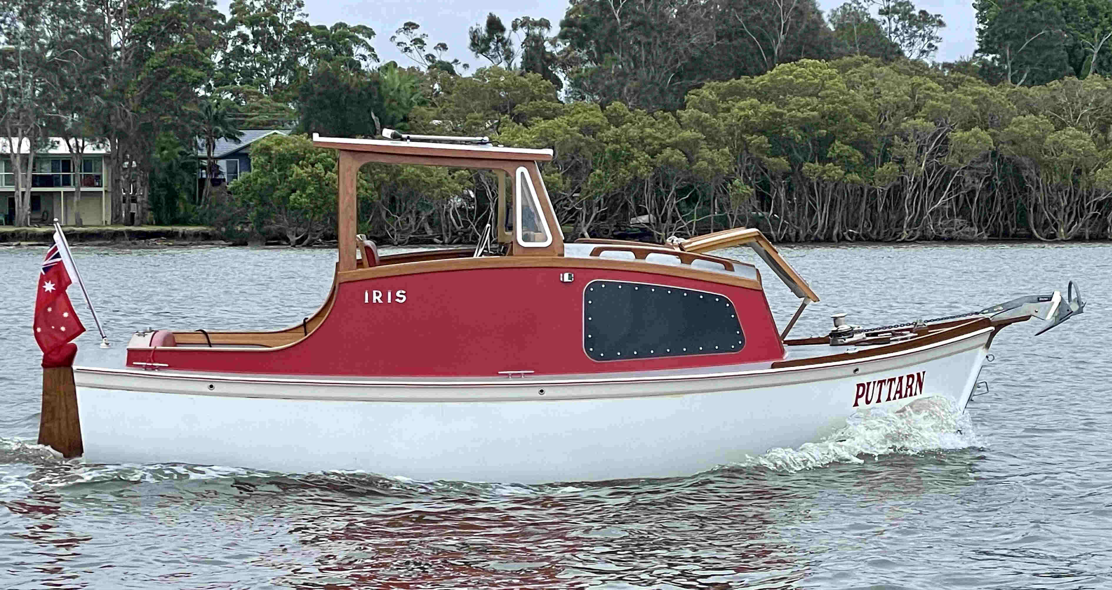 Timber half cabin putt-putt powered by a Simplex 10-12hp petrol engine. Hull- fine grain oregon sheathed in biaxial fibreglass, Frames- laminated silver ash, Stem- spotted, Keel- spotted gum, Hard Dodger- western red cedar, Trim- New Guinea rosewood.