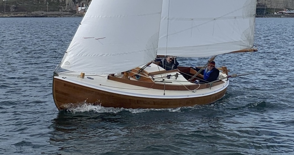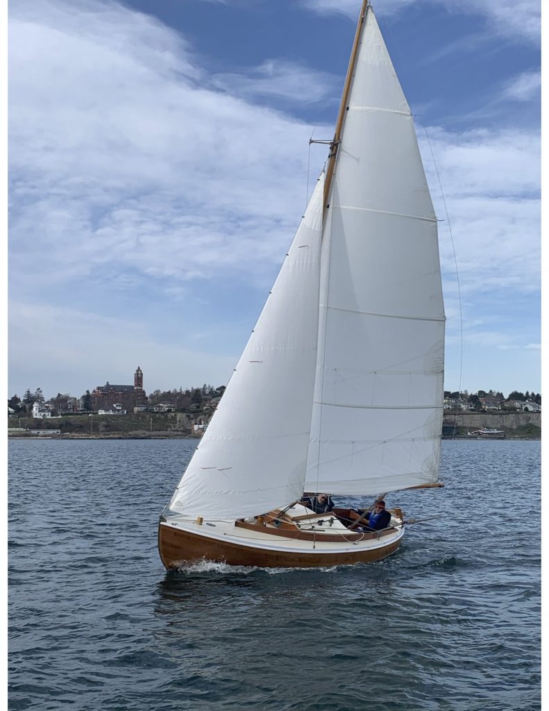 Stretched version of Auge Nielsen’s original 18.3′ design for EB White called Fern.Built of Honduras Mahogony tight seam planks on locust backbone and sawn and steamed locust frames, she is copper riveted and has 1100 lead ballast.
