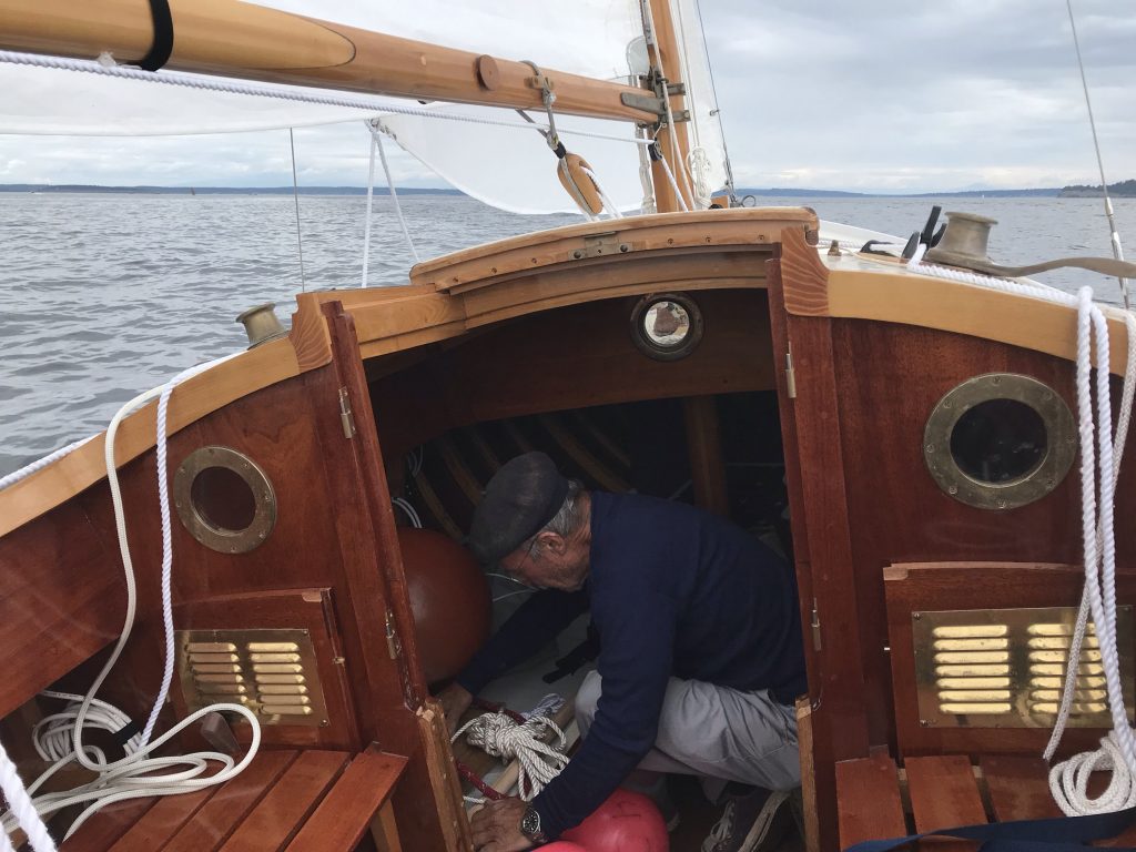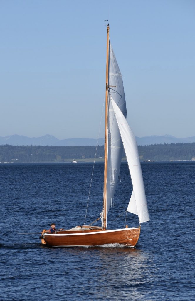 Her rig was modernized to a full batten main with a sail area ratio if 18.. She is fast, agile and extremely handy. She sails herself, holds her speed in the tacks and has won many races in the Port Townsend race event.
