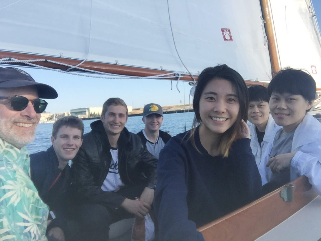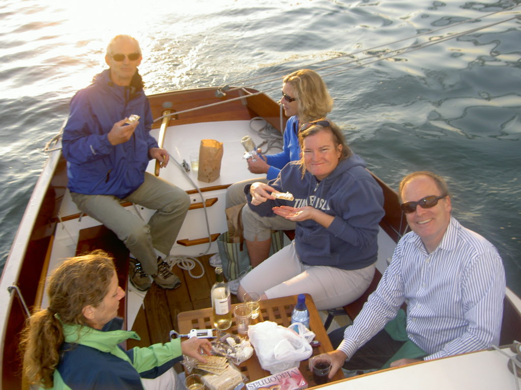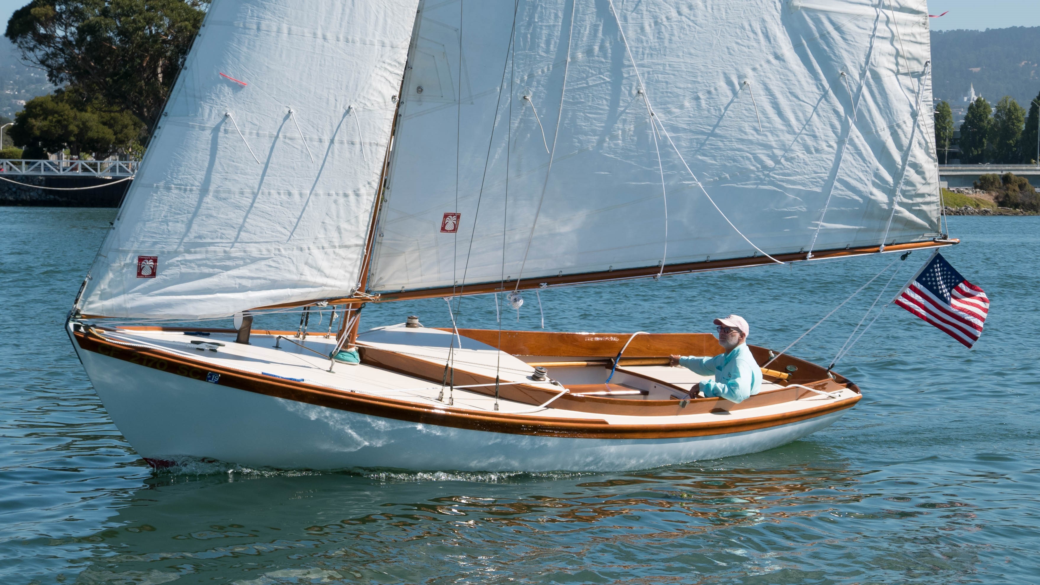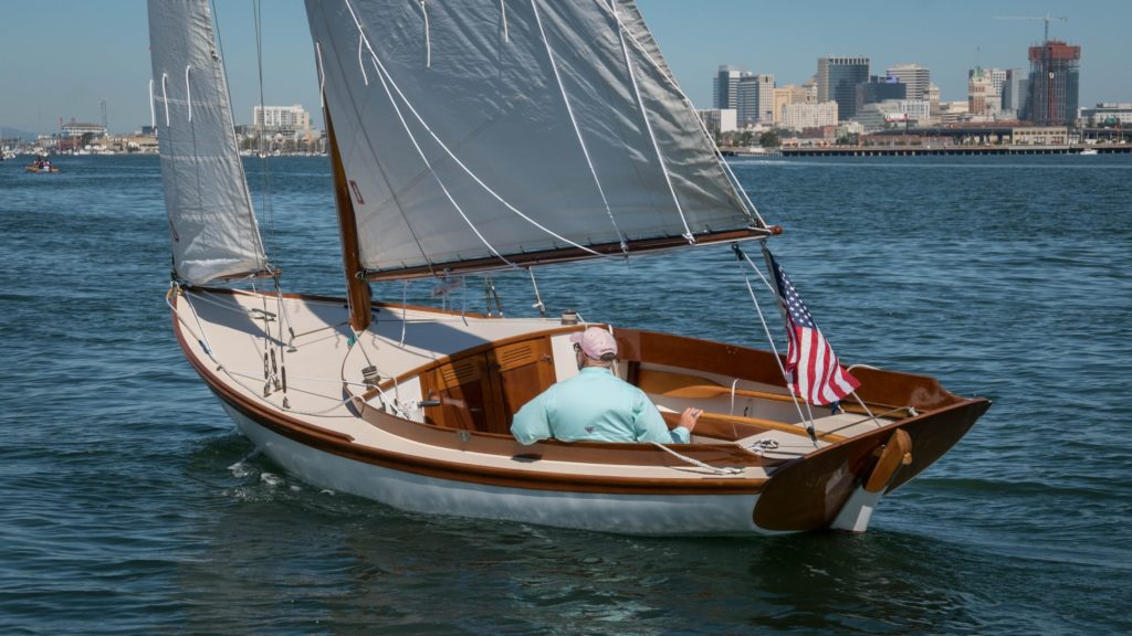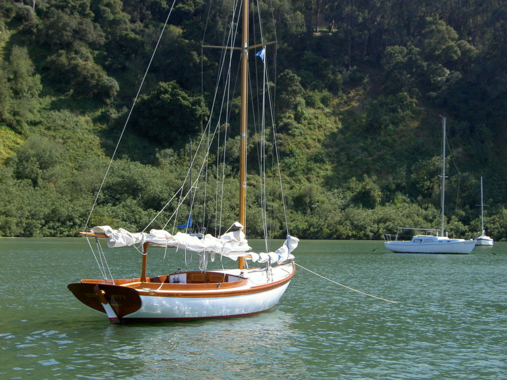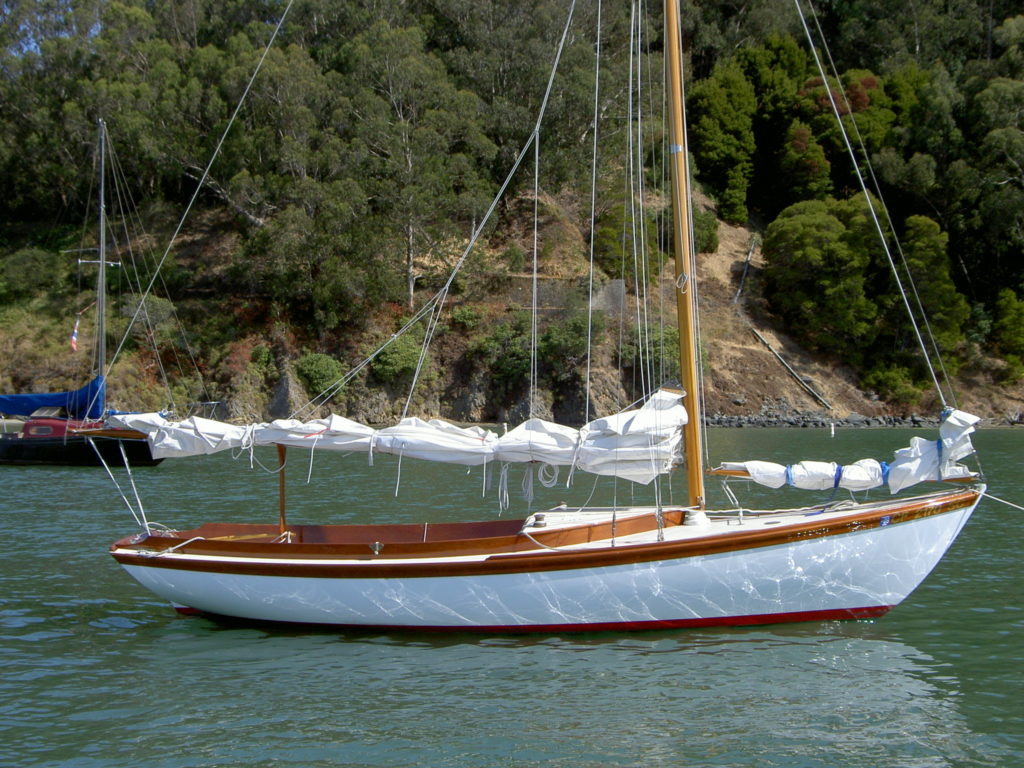 Serendipity is Hull No. 1 of the Pisces 21 sloops, built by Classic Boatshop in Bernard, Maine. She is designed by Chuck Paine, closely modeled on the Herreshoff Fish. This boat was built of cold molded construction in 1999 and finished very traditionally, with spruce spars, bronze hardware, no engine and three-strand running rigging. Subsequent boats have been built with fiberglass hulls, diesel engines or electric motors, carbon fiber spars and some electronics. However finished, they are all handsome boats.Serendipity has been on San Francisco Bay since 1999, originally in Sausalito, but since 2004 in Alameda. She is an excellent daysailer, with a large cockpit and has had literally hundreds of guests out for day sails on the the mild and warm Oakland-Alameda Estuary. But every year we venture out onto the cold and blustery Bay as well, even out into the Pacific beyond the Golden Gate. She’s also done minimalist cruises with sleeping in the cockpit at Angel Island. Pound for pound, she’s easily the prettiest boat on San Francisco Bay.