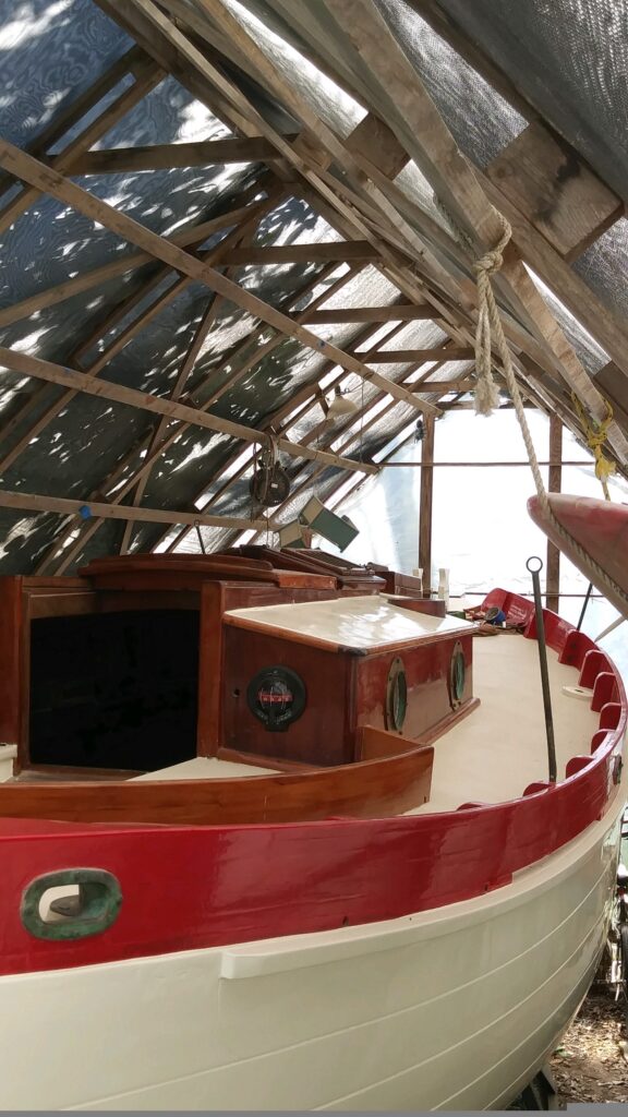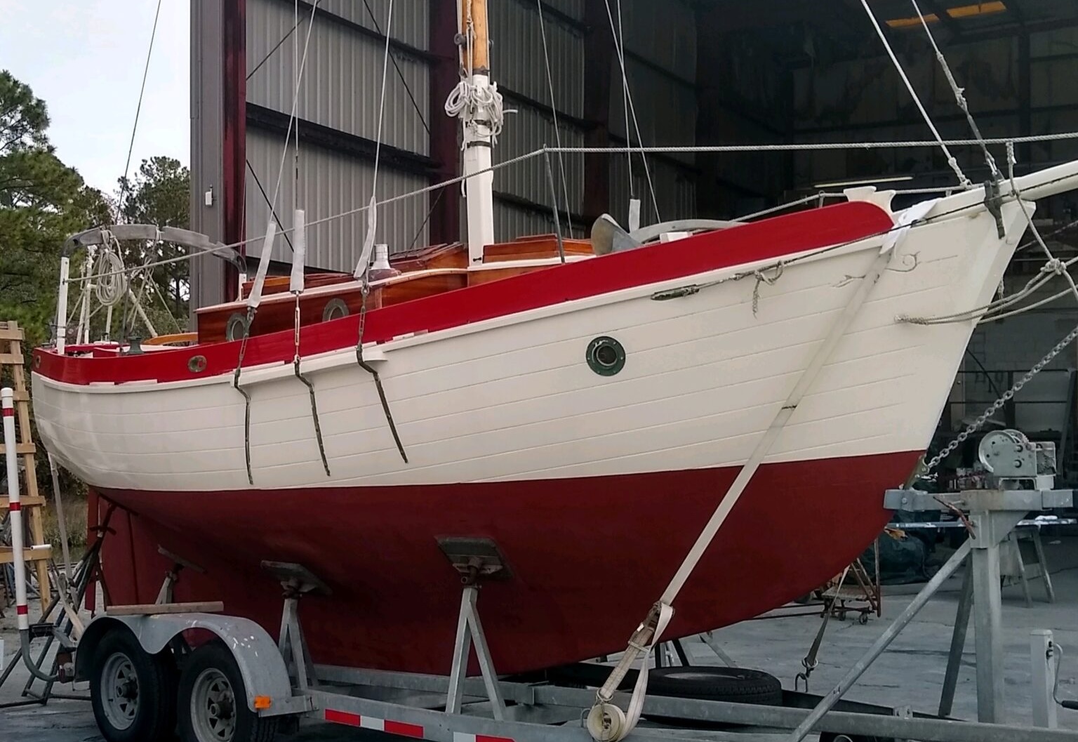 Atalaya is a 22 ft 2 in LOD, 27 ft LOA, 3.5 ft depth, full keel cutter, custom built in 1990 by Bill Stevens. She is a Glen-L Amigo design with deck and interior custom built following the design of Lynn and Larry Pardey’s first boat Seraffyn. Her original name was Jacana. We renamed her Atalaya after Atalaya Castle on Huntington Island State Park campground in South Carolina where we camped for years. She is strip-plank built with Alaskan Yellow Cedar, white oak frames and honduras mahogany deck house and interior. In 2002 we had a triad trailer built for her and took her out of the water in Beaufort, South Carolina and put her in our backyard in Athens Georgia due to a rotted deck and bulwark and for a rebuild and built a bow roof shed over her. Also added a cubic mini wood stove, natures head composting toilet, flex solar panels and lithium batteries. Lea and I built an eastport nesting pram and an origamy folding dinghy as tenders. We sold our historic house on 781 Boulevard in Athens, Georgia and transported our sailboat back to Beaufort, South Carolina in July, 2018 and have been living aboard ever since. Im 76 and originally from Ewing, New Jersey and Lea is 66 and from Ghent, Belgium. We have sailed the East coast from the Chesepeake to the Florida Keys. Currently on the hard in Elberton, Georgia. Planning to put our boat back in the water in the spring of 2025 in Penobscot Bay and explore coastal Maine.