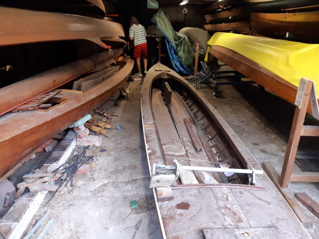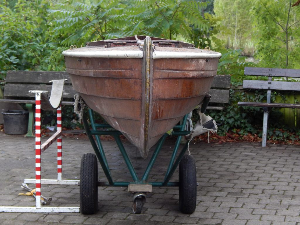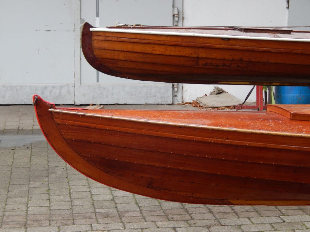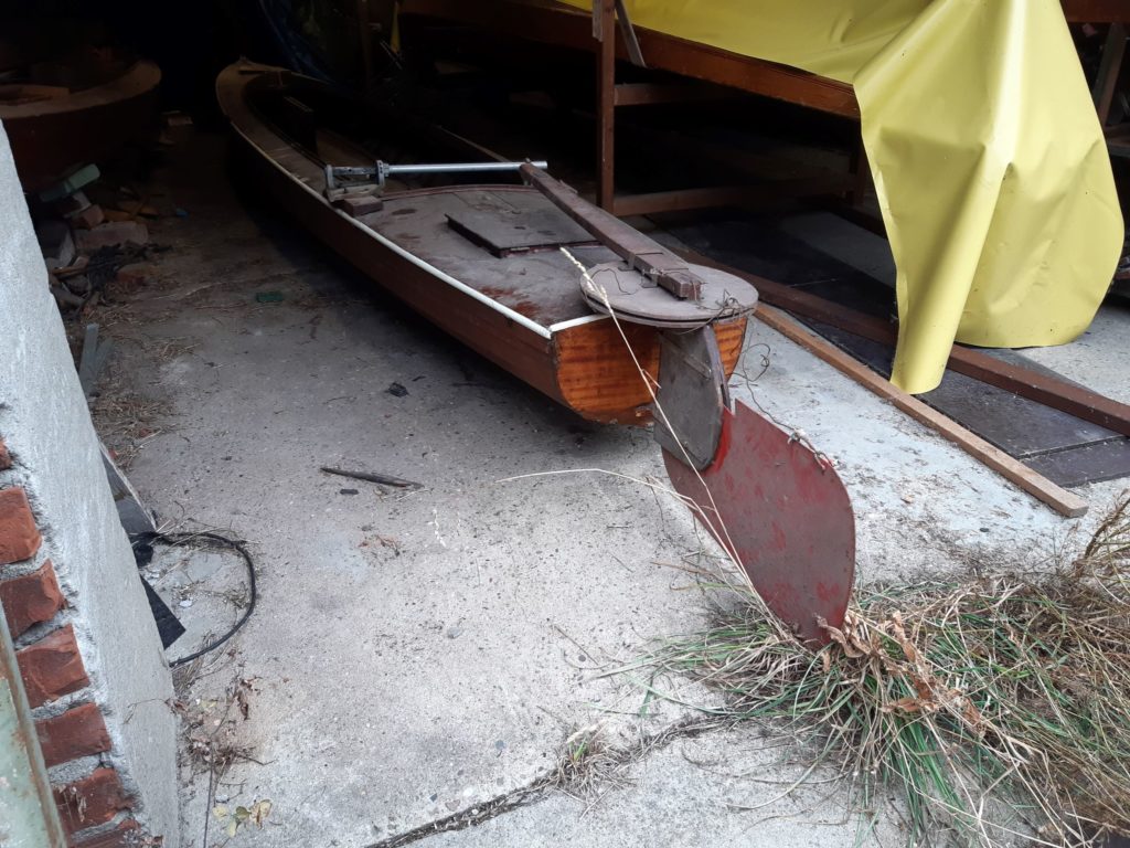 Our second “Segelgig” was build between 1910 and 1920 at the boatyard of Paul Langner in Friedrichshagen by Berlin, Germany. The lines look more modern than our last Segelgig. We sadly have not got any more information about it. We started to disassemble some parts and found some nostalgic parts from the time in the GDR (East Berlin) where it has been used as a motorboat. Because you were not able to get tropical timber in the GDR an old wardrobe has been used to build a bulkhead. We found leftovers of the old carvings on the inside. There are no plans left from exactly this boat so we always get some surprises. We first thought the boat would be a so called “Wanderrudergig” with two masts and the rudder on the stern. We now found an old cut in the keel to let a rudder through the keel and did not find any traces of a besan mast. We will do some more research on the boat and in old books and find the most original solution.