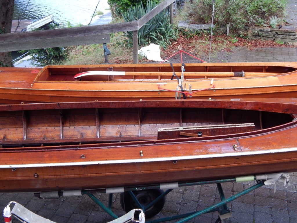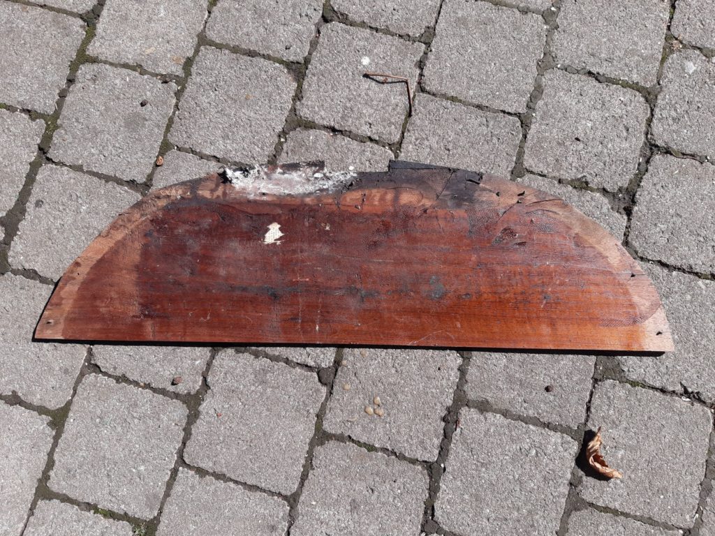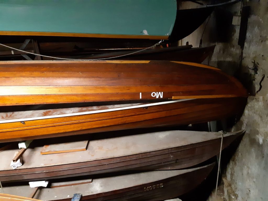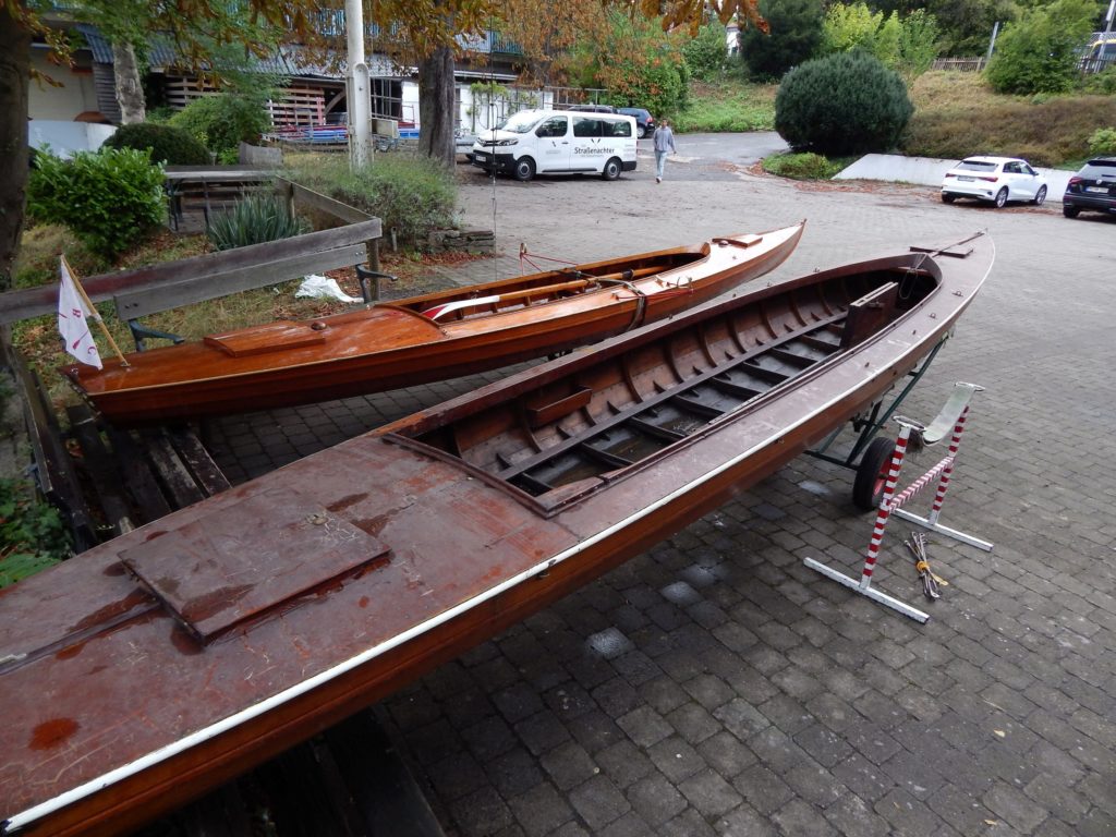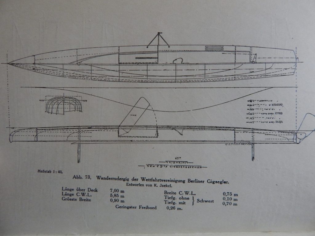 Our second “Segelgig” was build between 1910 and 1920 at the boatyard of Paul Langner in Friedrichshagen by Berlin, Germany. The lines look more modern than our last Segelgig. We sadly have not got any more information about it. We started to disassemble some parts and found some nostalgic parts from the time in the GDR (East Berlin) where it has been used as a motorboat. Because you were not able to get tropical timber in the GDR an old wardrobe has been used to build a bulkhead. We found leftovers of the old carvings on the inside. There are no plans left from exactly this boat so we always get some surprises. We first thought the boat would be a so called “Wanderrudergig” with two masts and the rudder on the stern. We now found an old cut in the keel to let a rudder through the keel and did not find any traces of a besan mast. We will do some more research on the boat and in old books and find the most original solution.