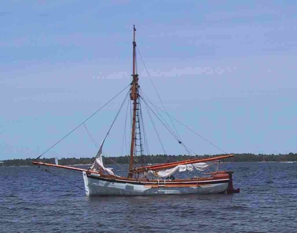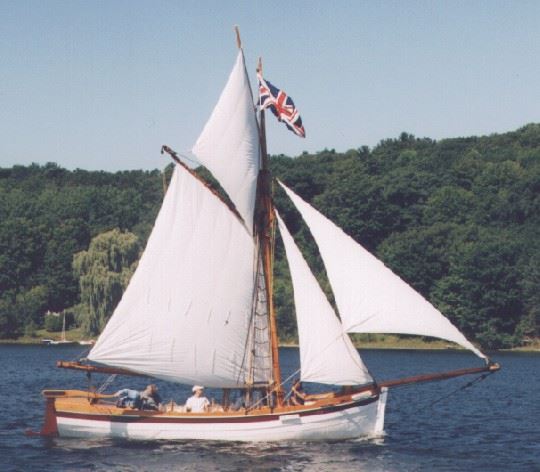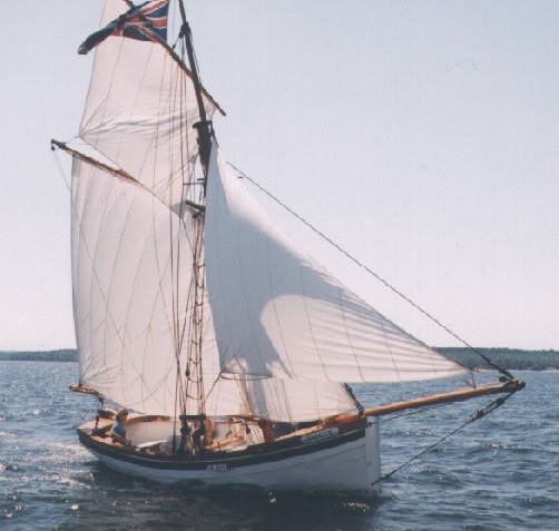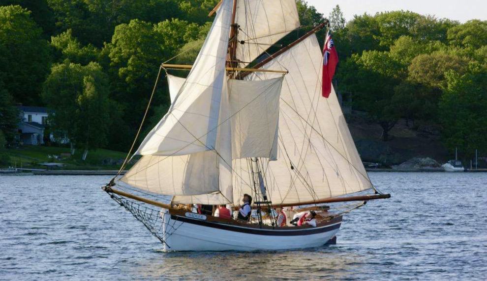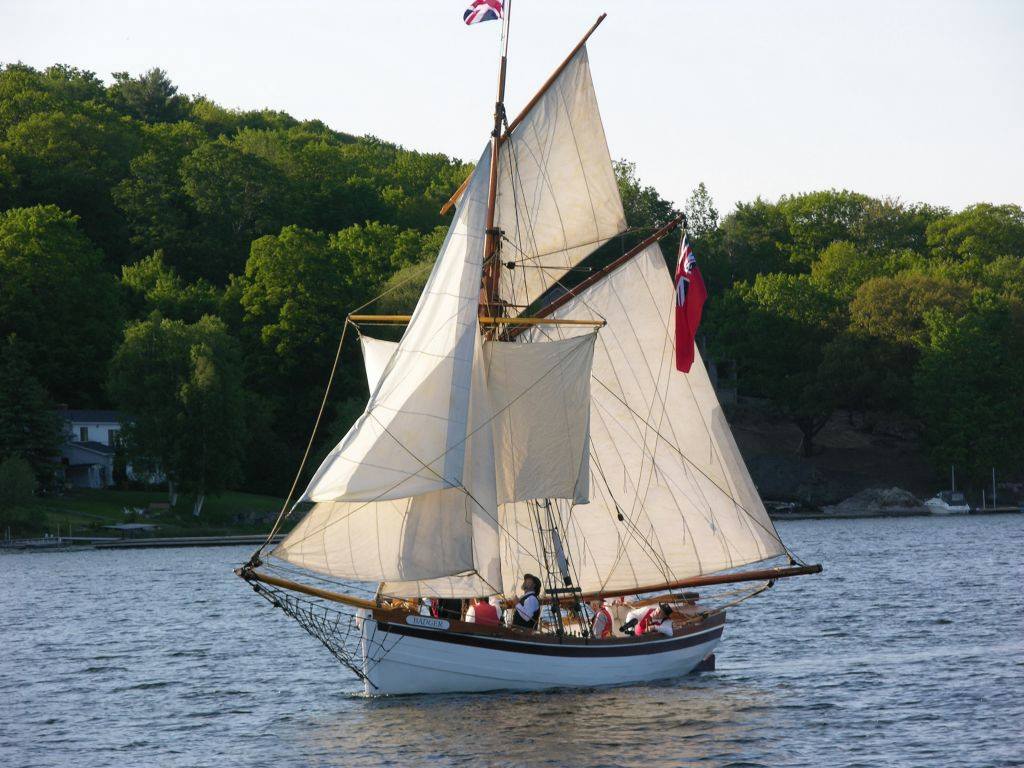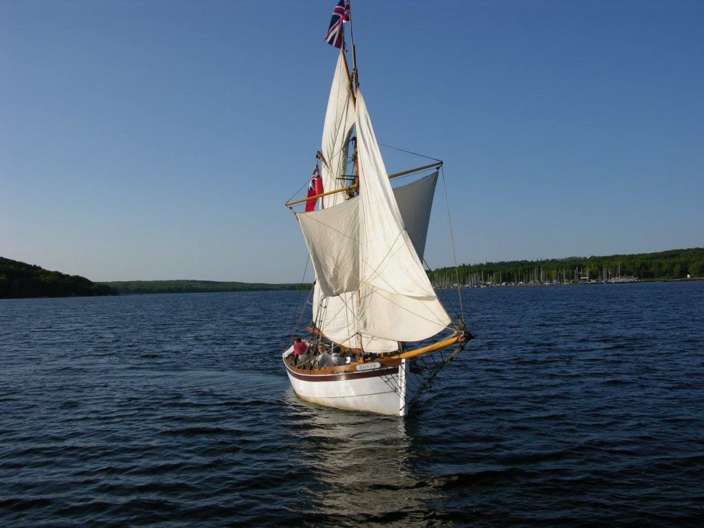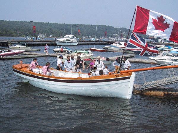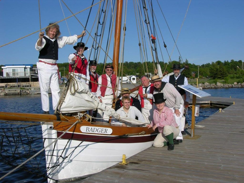 Badger’s hull was originally an aluminum lifeboat from a great lakes freighter, the “Fort Chambly” long since scrapped. The lifeboat had spent some time in a farmer’s field and was destined to be cut up for scrap. The owner made one cut into the hull but it was too painful for him to destroy the boat so he made an appeal for someone to buy it as a vessel for the price of the scrap metal. (You can still see the scar where we had to weld the cut closed). When we first saw her she wasn’t pretty but we could see the potential, so we stripped her down and started with a bare hull. The lifeboat was double ended but we wanted a nice wineglass transom so, instead of disturbing the integrity of the hull, we bolted on a metal framework on the stern and cladded it with wood. This false tansom allows us to hide an outboard outside the original hull. Mast and spars were made from spruce trees, cut from a nearby property. 1200 lbs of ballast are stored below the floorboards and enough foam is hidden away to ensure positive flotation.Work on the Badger started in the fall of 2000 and it was launched without spars on July 1, 2001. Over the next winter, spars, rigging and sails were completed and it was first sailed in the summer of 2002. Now known as Penetanguishene’s “Small Tall Ship”, H.M.S. Badger is a familiar site sailing on Penetanguishene Bay, and regularly participates in special events, re-enactments, and community activities. Combined with crew and officers in period uniform, her overall appearance and 19th-century detail make her a real crowd-pleaser wherever she goes. Throughout the spring, summer and early fall she is moored at the Penetanguishene Town Dock, just across from the Dock Lunch.