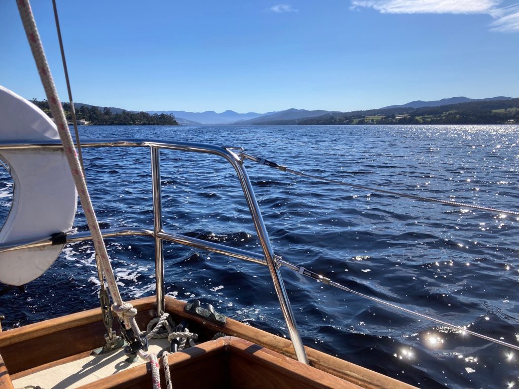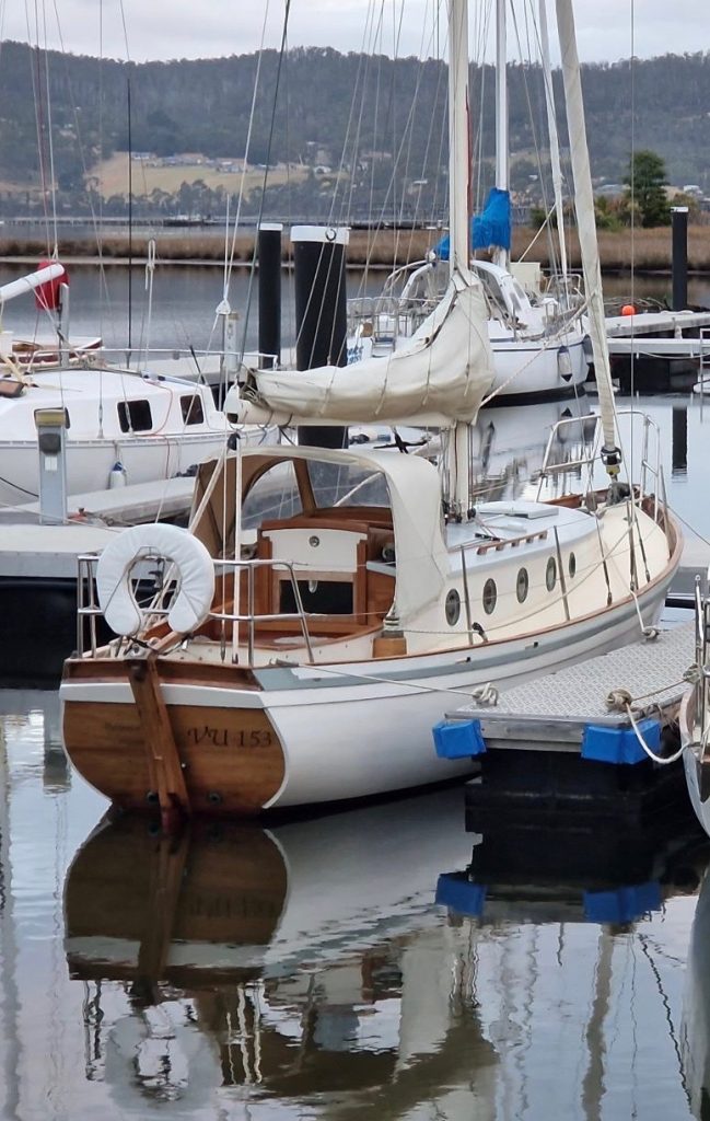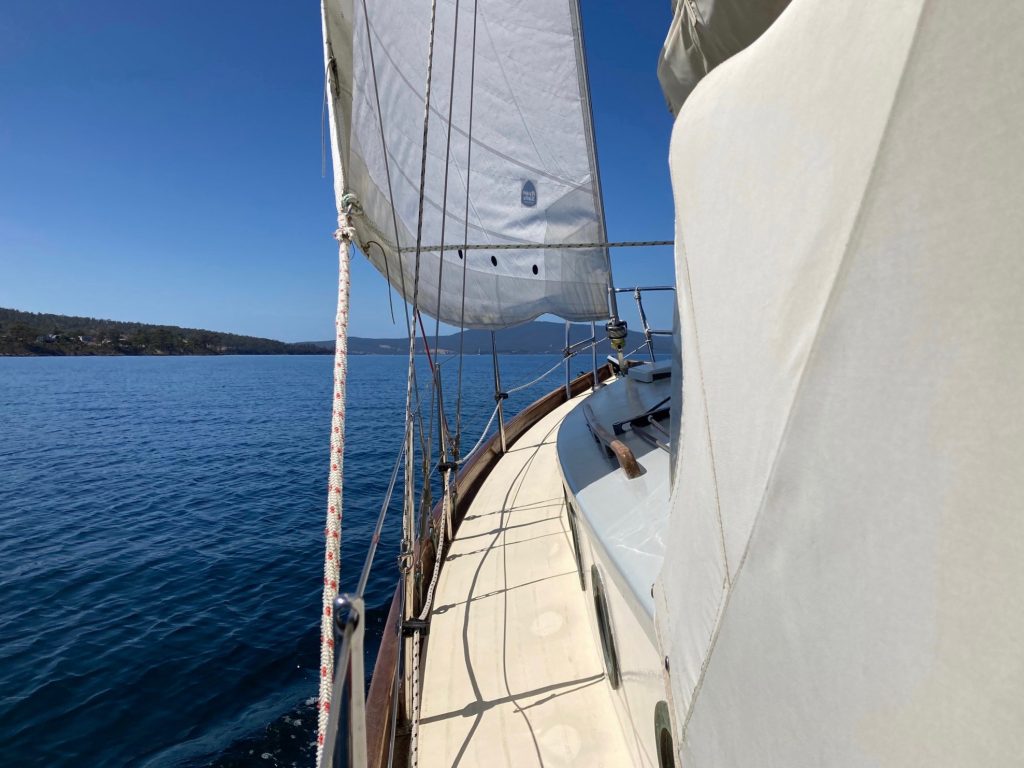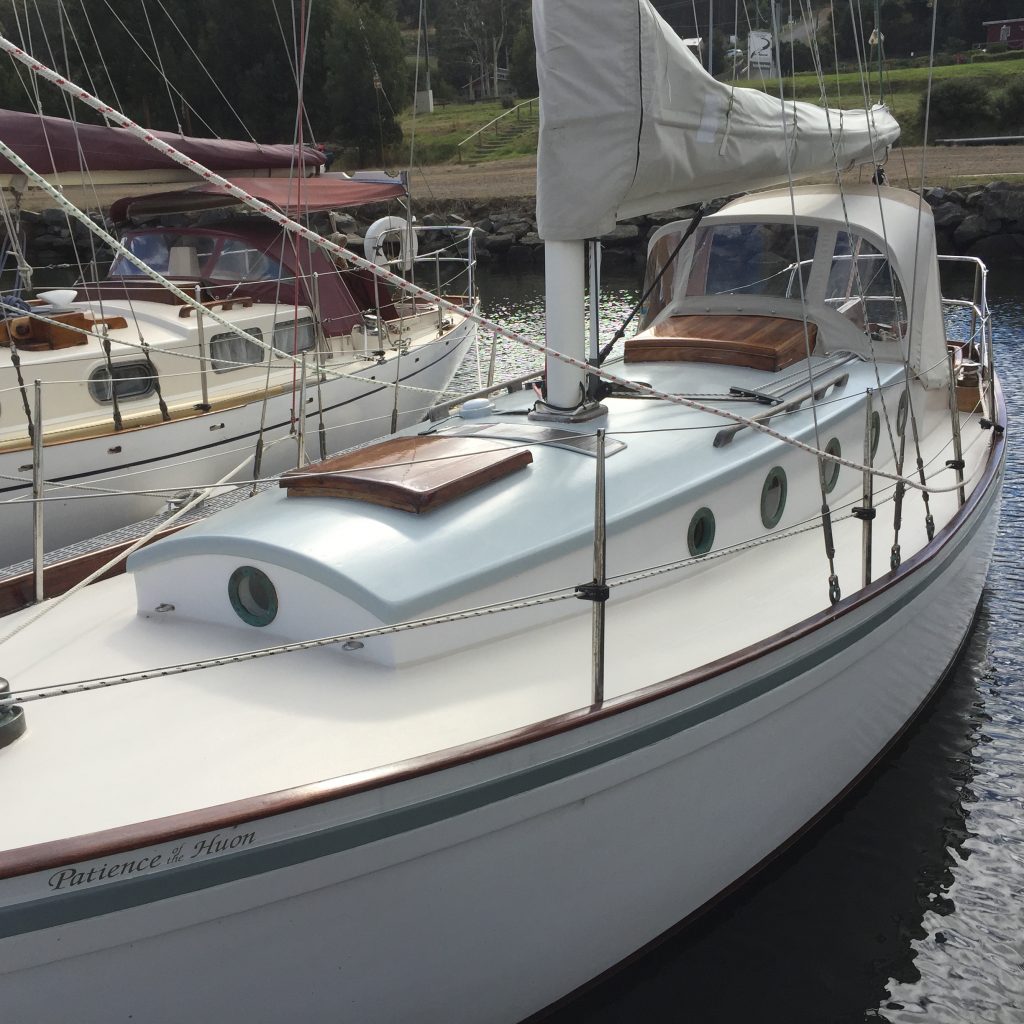 Patience of the Huon is a Laurent Giles Vertue, or to paraphrase, “Patience is a Vertue”. Her keel was laid in 1970. Six years was spent building her hull, whereupon she was sold to owner #2 who completed the hull planking and carried out limited deck construction, raised a family and established two successful businesses as a result of which little more work was done on her. Twenty six years later, seeing that the project was unlikely to be completed by him, with a heavy heart put her on the market. Seeing a hull that had been constructed thus far with care and knowledge, always under cover, I purchased the incomplete hull and spent the following seven years completing the project. Thirty nine years in construction may not be a record, but it has to come close. She was launched in late 2009 and shortly thereafter sailed from her place of construction in Victoria across the potentially challenging Bass Strait to southern Tasmania where she now lives.
