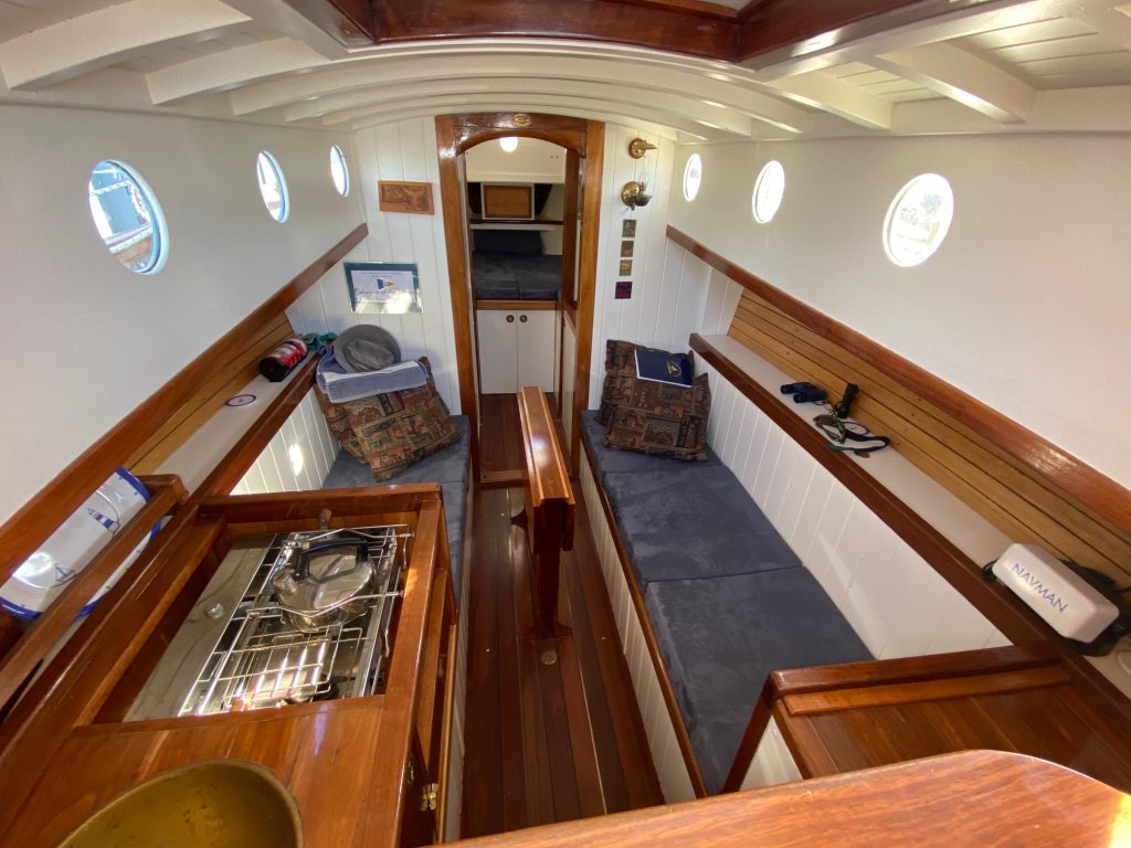 Patience is constructed of Afromosia planking on E. Maculata (Spotted Gum) frames and has Grey Iron bark keel and stem. Interior fitout is Spotted gum and Jarrah, a beautiful deep red timber of Western Australian origin. She sails now on the Huon River for frequent day-sails, and further afield up the Tasmanian East coast and the d’Entrecastaux Channel.