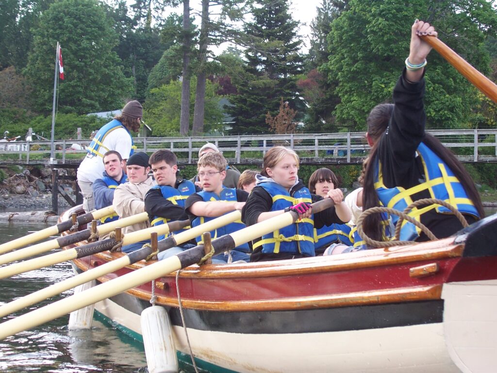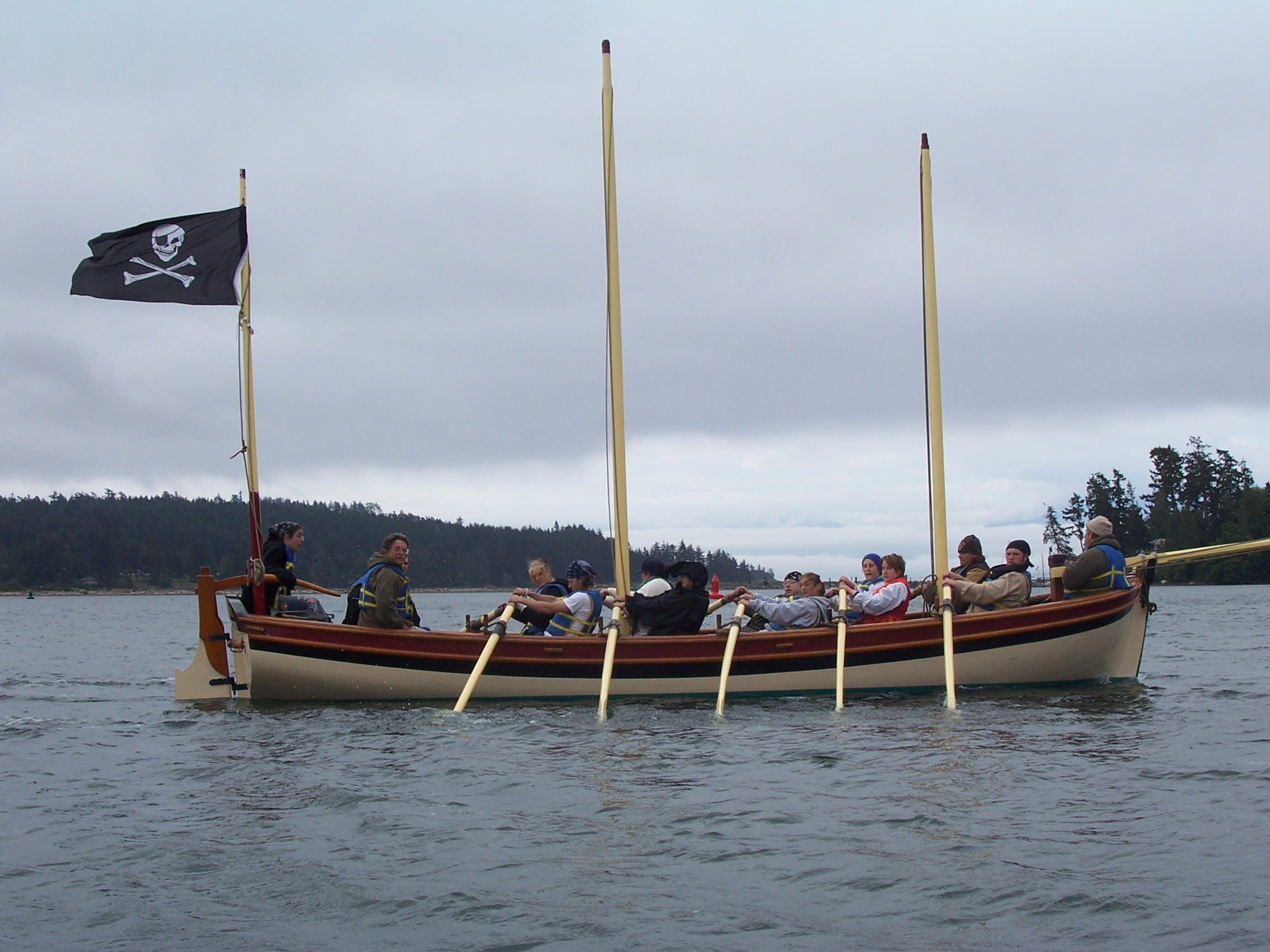 The Grays Harbor Historical Seaport in Aberdeen Washington built and operates the tall ship Lady Washington and two longboats which are replicas of the largest boats carried on deck the trading ships that came around the horn to trade on the west coast of North America for sea otter pelts. These large ships boats were stoutly built to withstand the rigors of coming alongside the ship in heavy conditions and landing on beaches. They carried heavy loads to and from the ship. Retrieved anchors, ferried water and supplies, and carried on trade on shore. These replicas weigh 5,000 lbs each, carry 15 crew and passengers with ten rowers, three masts setting dipping lugsails