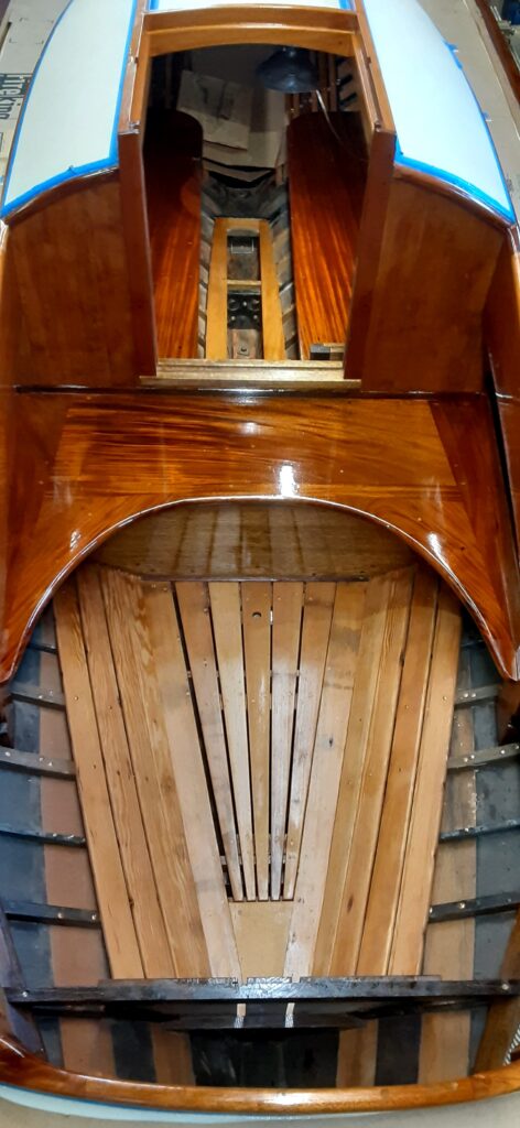 The hull, bright work, and interior sanded and 15 coats of varnish applied.