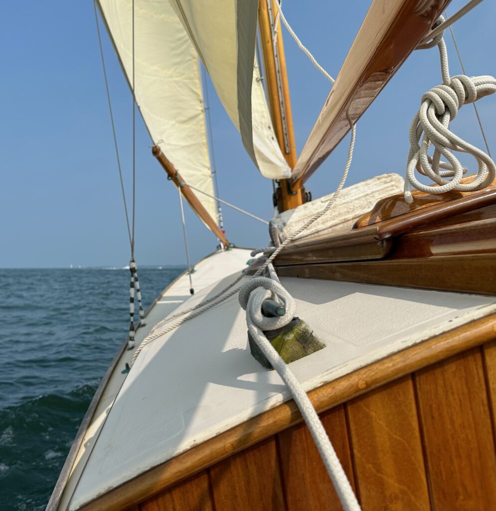 Cadenza was built in 2003 by Rockport Marine from L. Frances Herreshoff’s Rozinante plans. The design was modified slightly by Doug Hylan to move the mizzen aft in order to make the steering more comfortable, effectively turning the original ketch sail plan into a yawl.Cadenza is built traditionally with cedar planking on oak frames and spruce spars. While the original Rozinante design was set up for rowing as auxiliary power, Cadenza has an 8 HP Yanmar diesel.