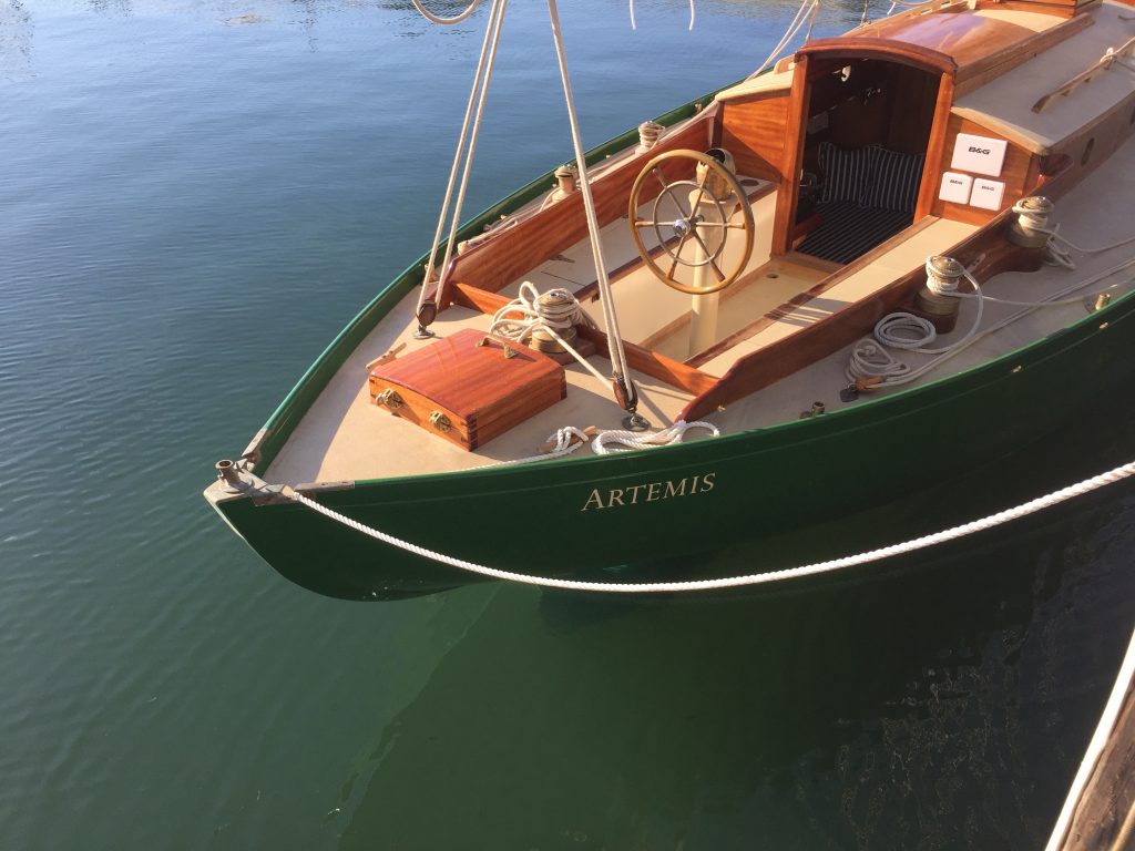 In 2015, a customer approached us for a larger version of Celeste, a canoe-stern centerboard sloop that we launched in 2003. The result is ARTEMIS, a 31’ gaff sloop which can be easily handled by two. Her cypress interior sleeps four with an enclosed head, and aft galley. She takes a chop with ease, performs well to windward, and her cockpit seats six adults. Her Irish Kelly-green topsides turn heads.Already a member? Log in herePhotos