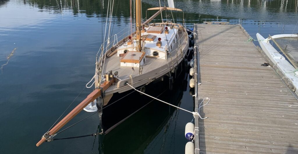 A restored 8′ Fatty Knees dinghy sits on the cabin top. I don’t think you can legally own a Lyle Hess BCC, or F34, without a Fatty Knees dinghy. This one made in 1986, before the Edey & Duff production run.