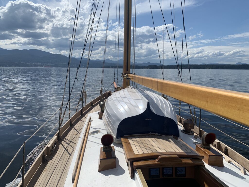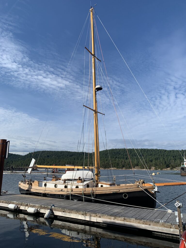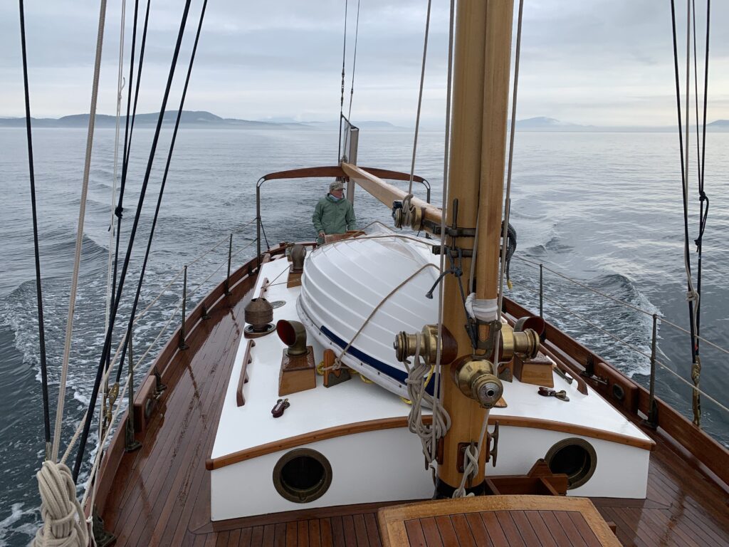 Sails were built by Northwest Sail and Canvas of Clipper Canvas, a cream colored polyester cloth often used on traditional vessels. The main is slab reefed, the staysail hanked on, and the jibs, genoa and drifter all flown from a luff furler which is pulled in/out on the bowsprit with a traveler. Though Aarda is a basic Bermuda cutter rig, one sister ship built by Bryan, “Lookfar”, is gaff rigged.