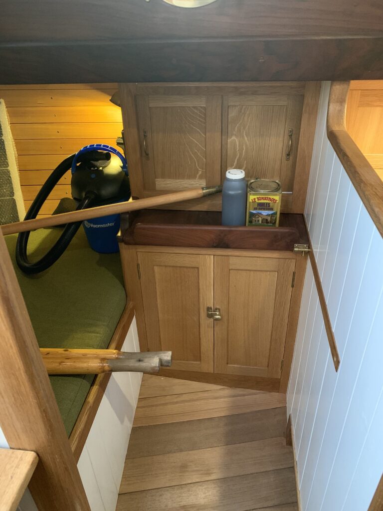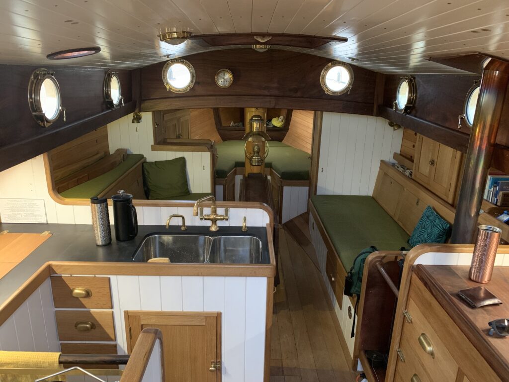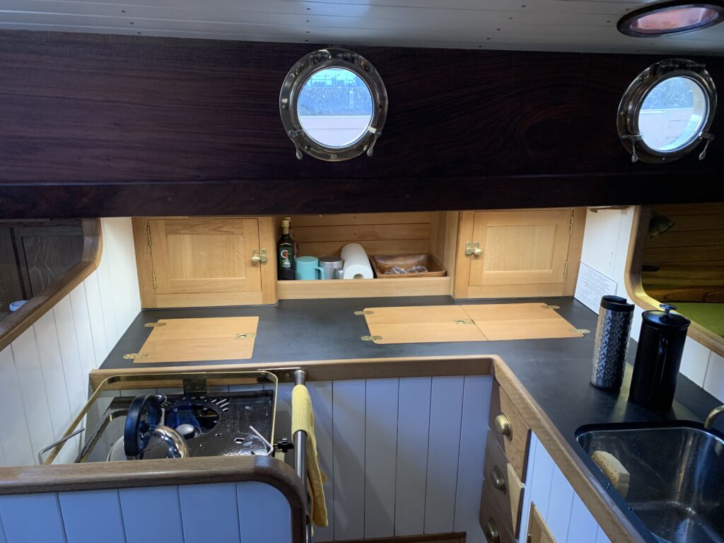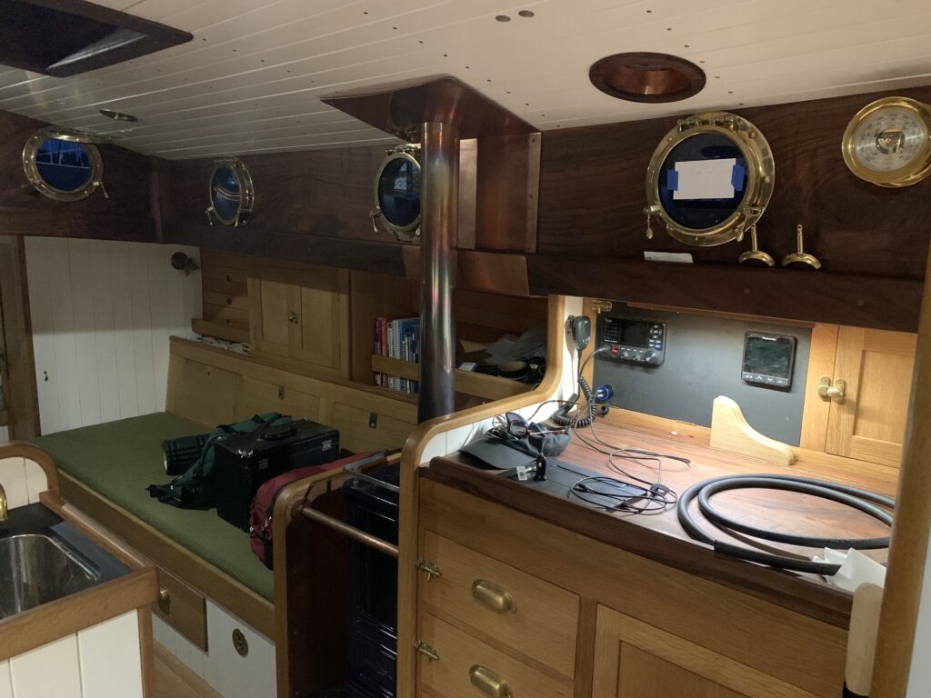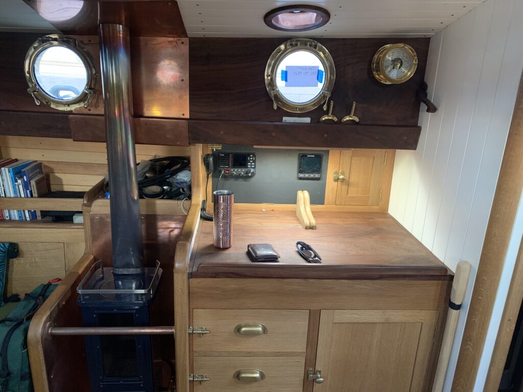 Interior systems are a modern compromise. A 400Ah lithium electrical installation with high output alternator and LED strip lights, along with a kerosene cooktop and cast iron diesel heater. Pressure water, with engine hot water calorifier along with foot pumps for both fresh and salt. The toilet is a modified C-Head composting toilet. There is a modern chart plotter, which conveniently hides away along the companionway, doppler radar, AIS, depth, wind and radio all on a NMEA 2000 backbone.