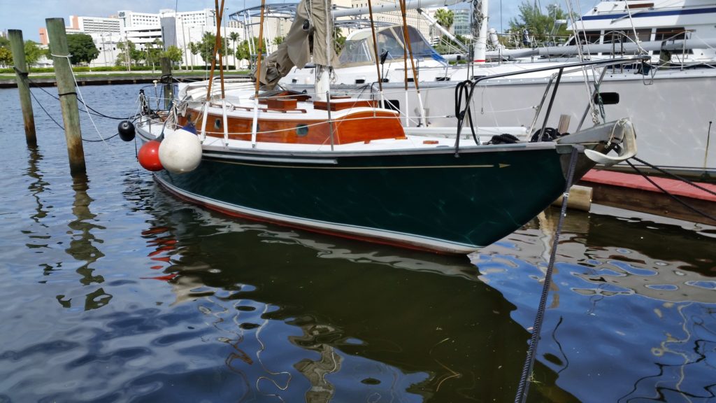 Mandarin has been a part of our family for over 30yrs. A Ray Creekmore design, custom built byRobert Day near Newport, she was his personal yacht(wonderful article on him/her..Into the Fog), then named Greensleeves. She has two Newport/Bermuda races under her keel. Spent 12 yrs in Annapolis., and 18 mos cruising Bahamas before she cam3 to us in 1992. A delight to sail, many years cruising Fl Keys.A custom mahogany interior, full queen bed V birth, pressure water…a “romantic lady”she is. Teak cabin exterior from a single 18’ board, unheard of today, oil lantern and otiental carpet complete her warm interior.