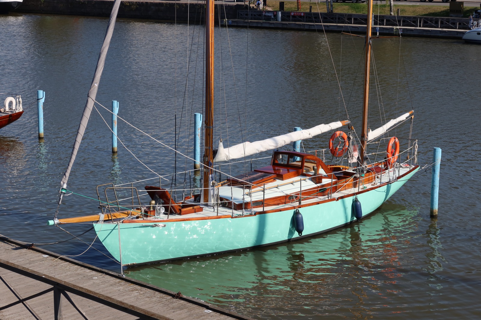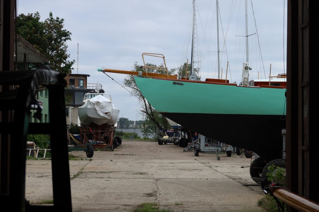 She needs some attention on underwater part which I am doing step by step. First part of 2024 was spent for entire refreshing of all varnish – in cabin, on deck and spars, therefore I had short season with launching only in August.