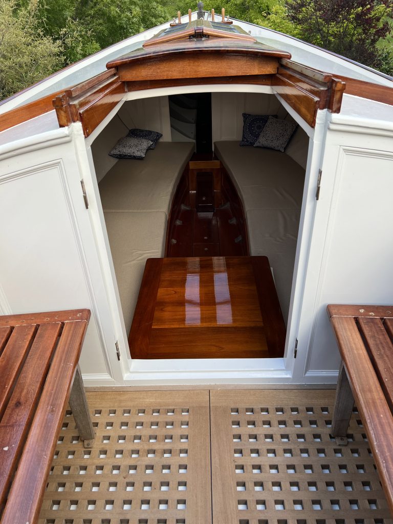Ngatira has been under our custodianship since 1989. She underwent a conversion from gaff rig to a fractional rig with mast placement change and cabin with dog-house in 1964. We returned her to the original build with gaff rig configuration and low cabin. This was done in 2005 and took five years at a restoration school in the far north. I completed the work over one year as the school closed due to lack of students.Mast step and rudder box were severe ares of water ingrees and was not addressed at the first restoration. I undertook this over another five years at my own property – 2020-2015. Through Covid and other work commitments. Replacing garboards, hood ends, new rudder box, stern post and rudder and mast step. Interior was built with settee back and cupboards installed.