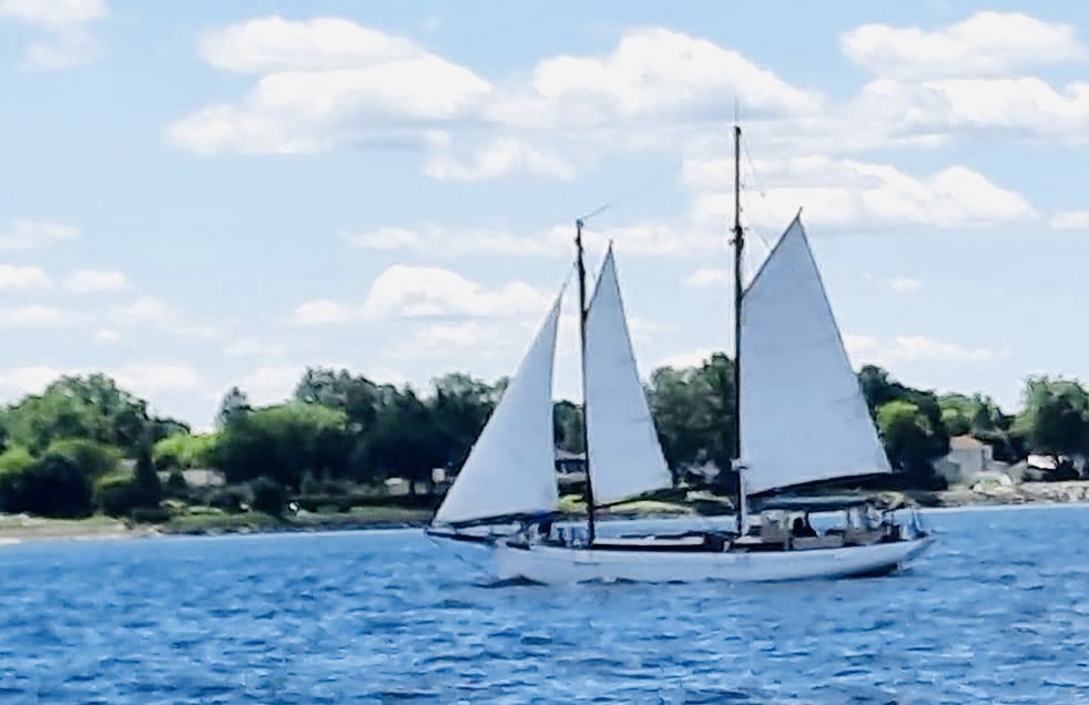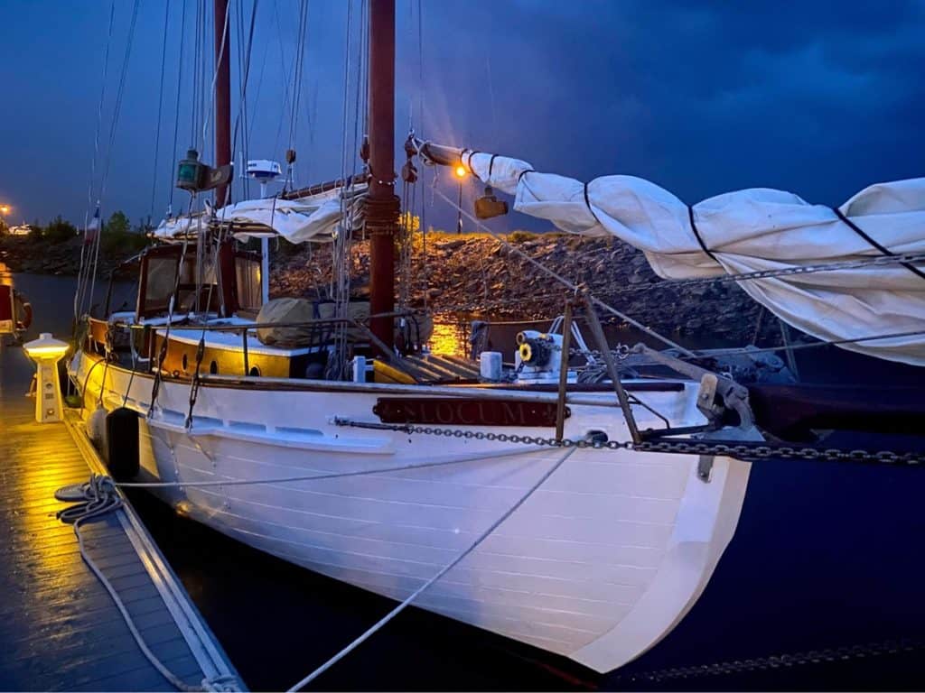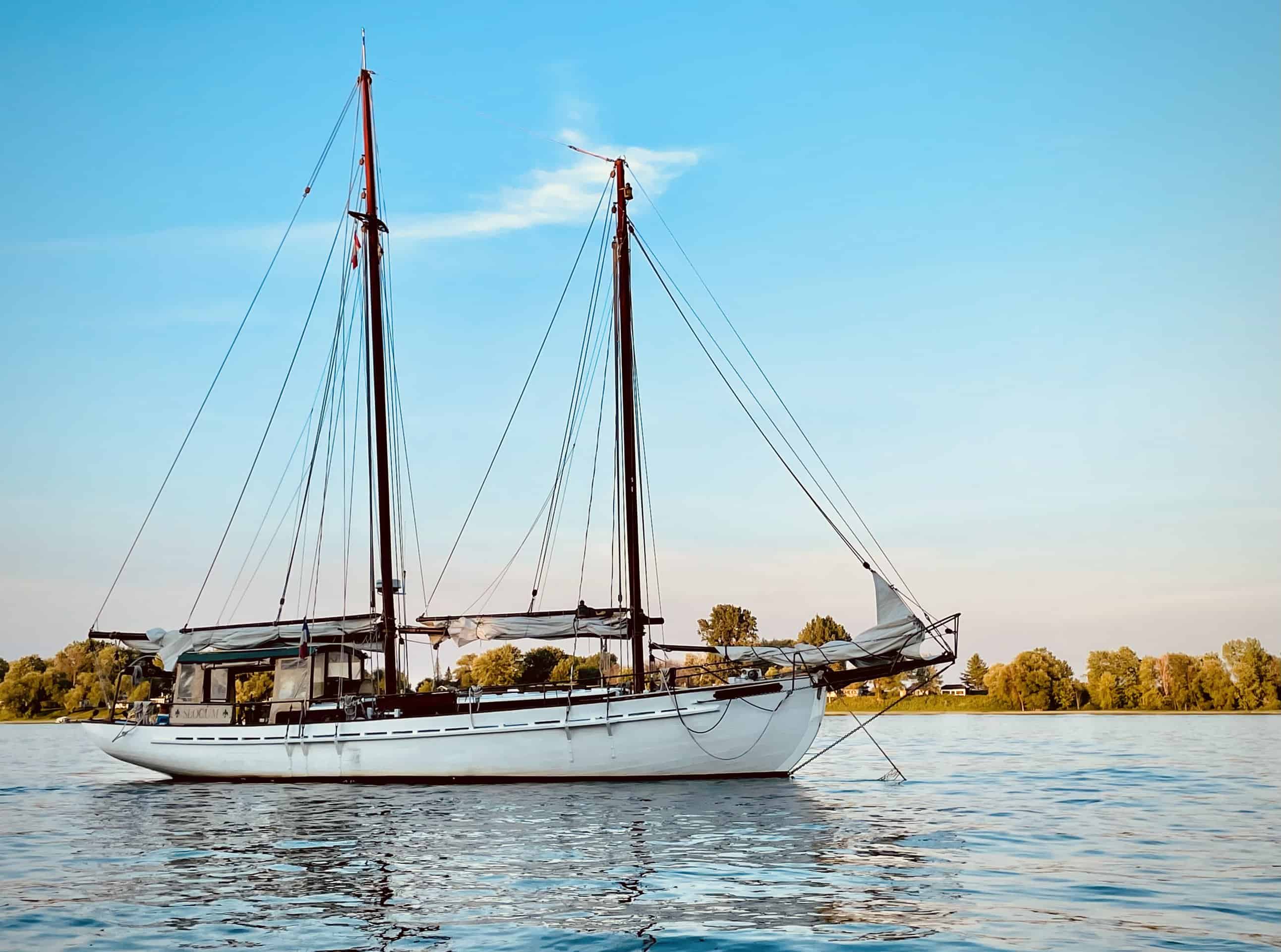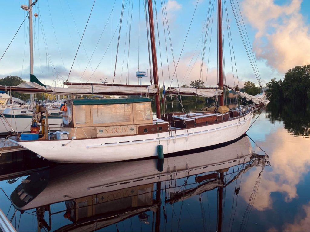 Schooner Slocum, Howard Chapelle, Corsair 41, 1980. Built in Sorel/Quebec/Canada per Jacques Fortin. Probably the last traditional built schooner in Quebec. Wood, oaks frame with mahogany planking. 41 feet on deck, 52 feet total, 5’10’´draft, 22 000 lbs. Sailing ground: the Sorel Islands area on the St-Lawrence river, Quebec, Canada. New owner/captain Stéphane Massie. Previous owner/builder, Jacques Fortin.