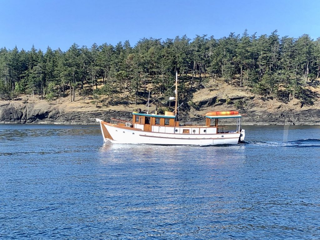Secretary Isle, designed by Frank Fredette and built in 1952 by John Nicholson of Victoria as a combination fish boat and pleasure boat. Called a troller-cruiser by the designer, measurements are about 44’ x 12’6”.Her original name was MarJayEn and her second owner in 1988 (John Homer of Sooke BC) gave her the name Secretary Isle after a small island outside of Sooke Harbour. He sold the boat in 2009 when he was 97 years old. The third owners, Steve Gordon and Julie Hart, Friday Harbor, owned the boat until 2022.